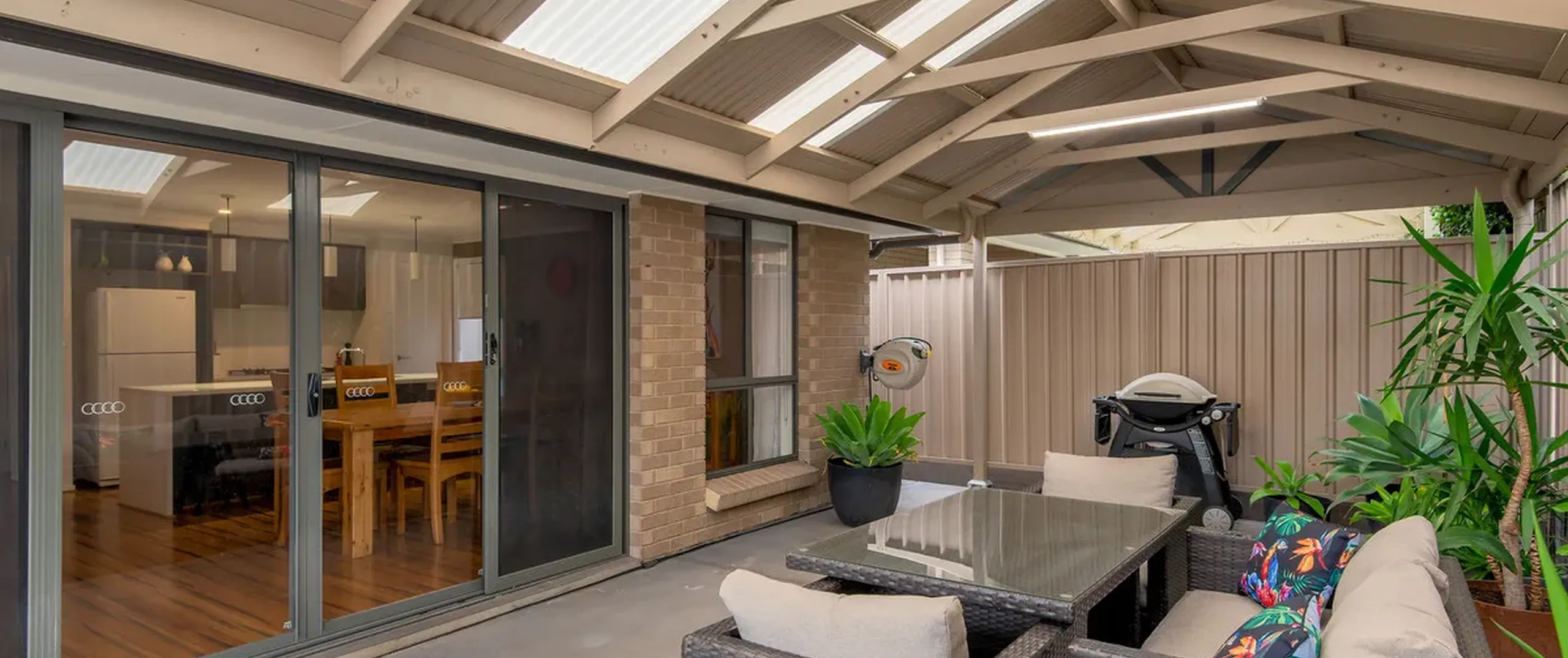 - Large pergola with pitched roof, perfect for outdoor entertaining