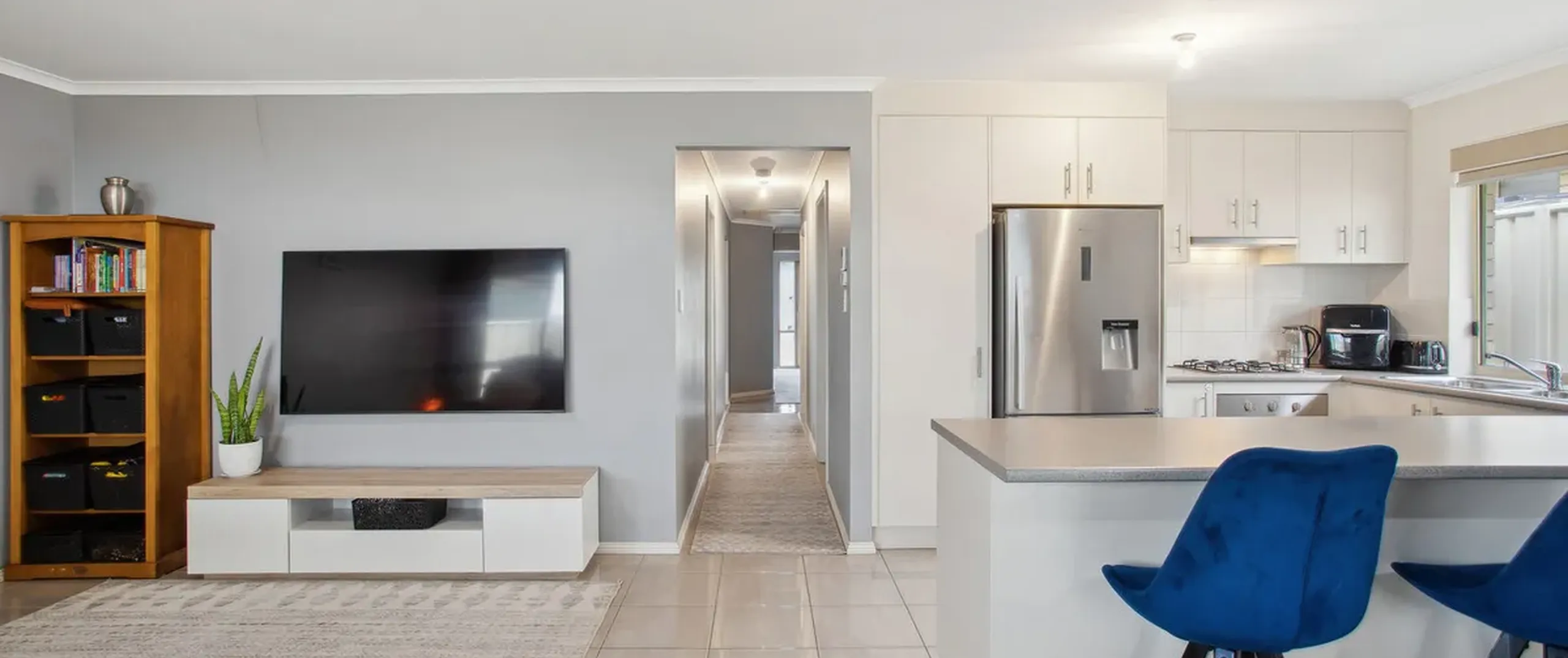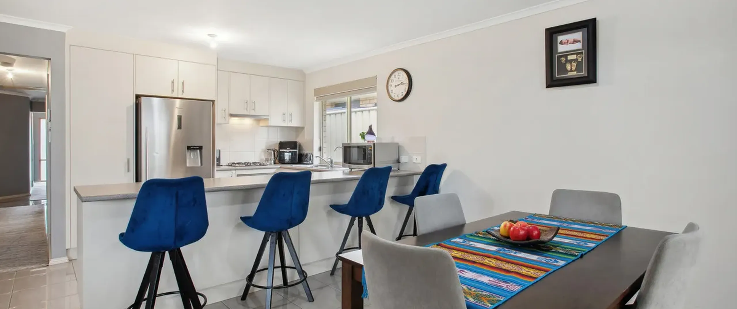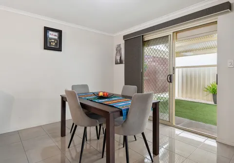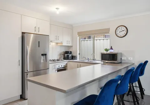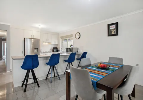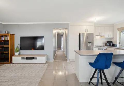 The journey begins in the tiled entry hallway, leading you to the heart of the home—a spacious open-plan kitchen and dining area. The timeless kitchen is a cook's delight, offering a gas cooktop, ample cupboard space, and a breakfast bar that combines functionality with aesthetics.