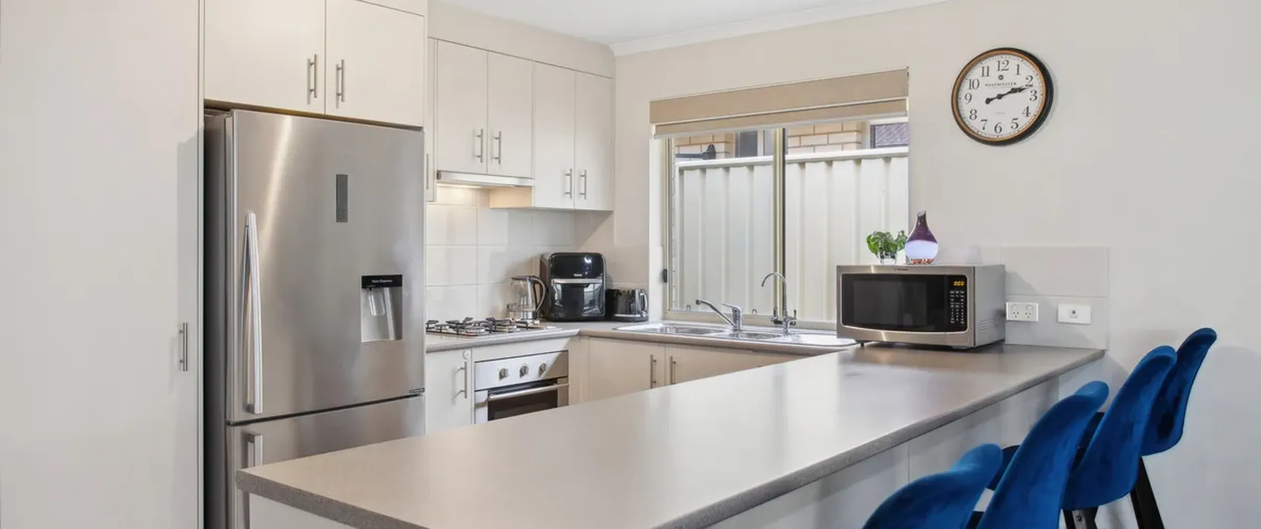 - Modern kitchen featuring sweeping benchtops, gas cooktop, dishwasher, pantry, and breakfast bar