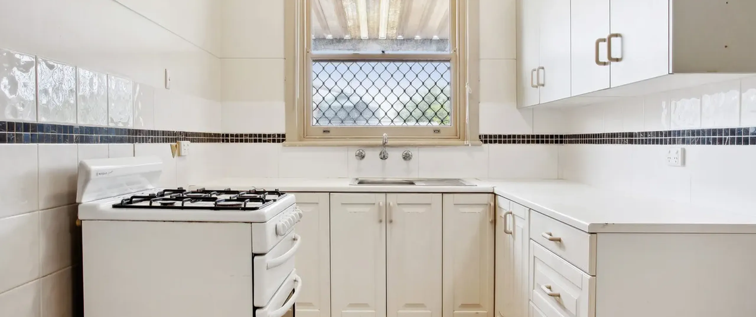- Practical kitchen with gas oven and overhead cupboards