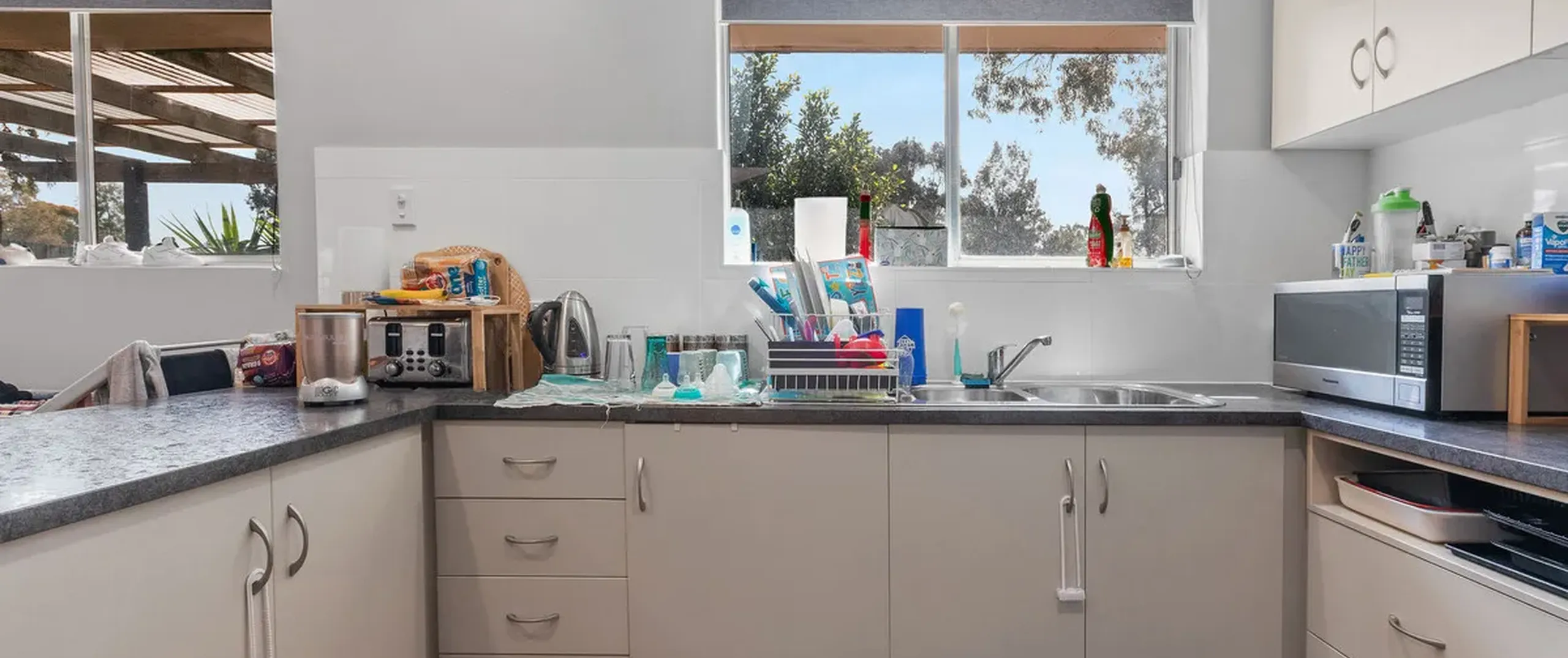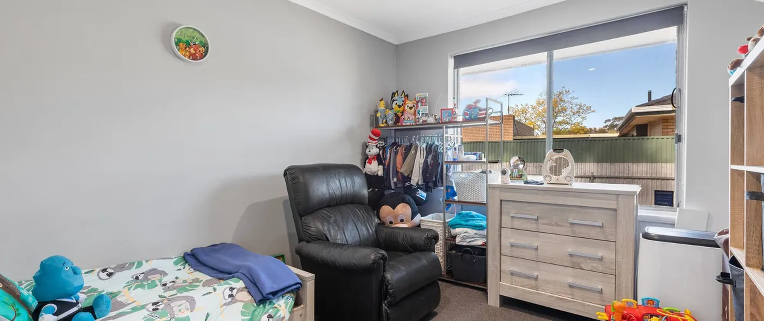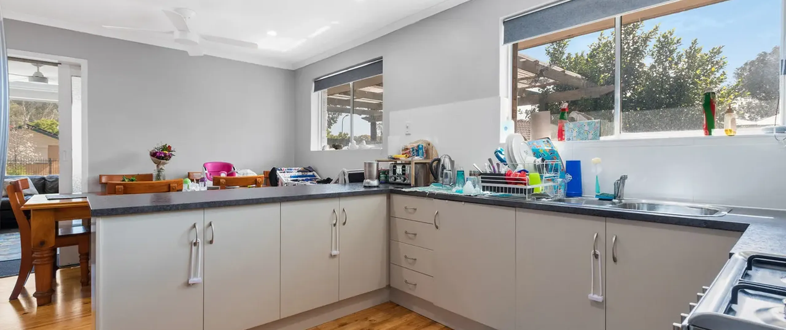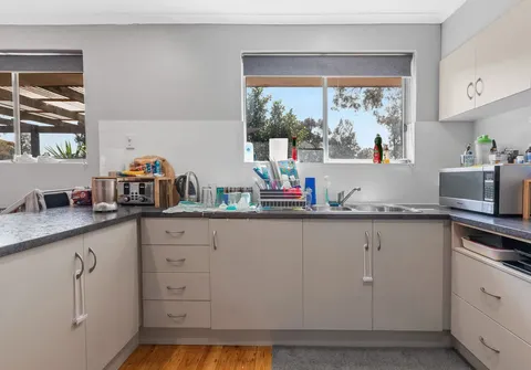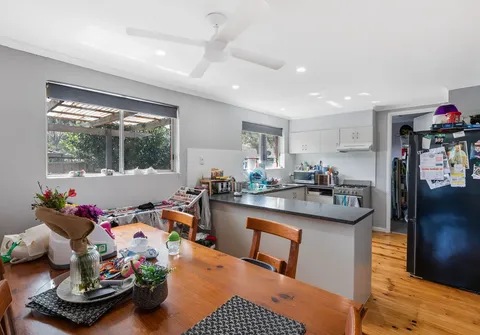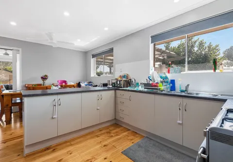 The home currently offers three bedrooms, all with easy access to the main bathroom with a bath and separate toilet. The living space is open-plan with air-conditioning and a wall heater as well as large windows that frame views over the backyard. A sliding door opens into the dining room and kitchen with beautiful wood floors, plenty of storage and a breakfast bar.