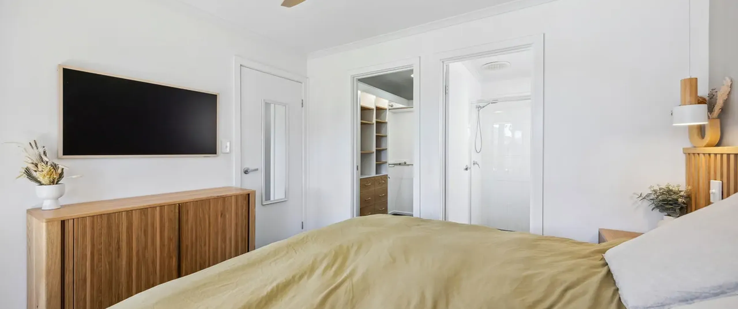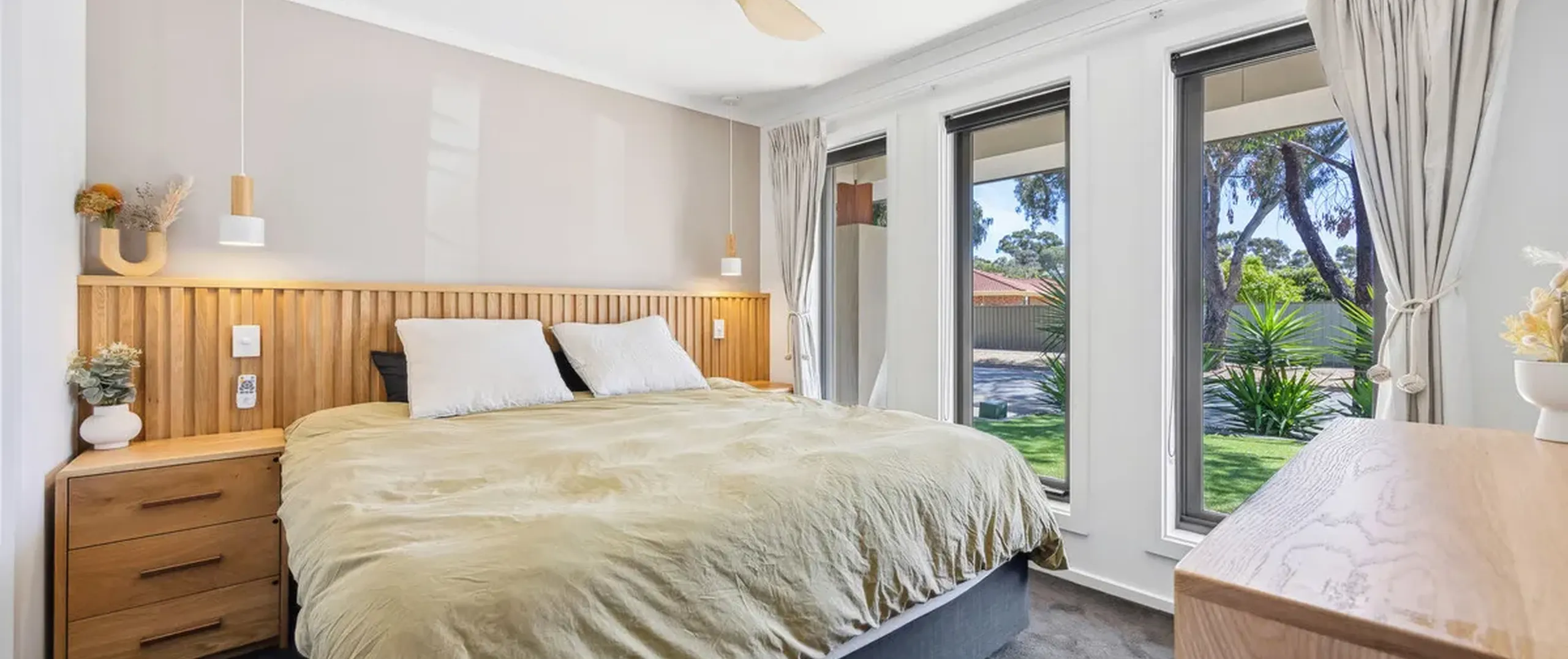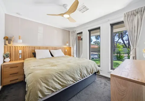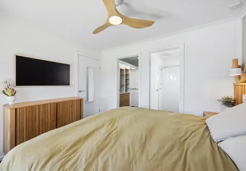 - Master bedroom complete with built-in bedhead, feature pendant lights, ceiling fan, walk-in robe and ensuite featuring matte black fixtures