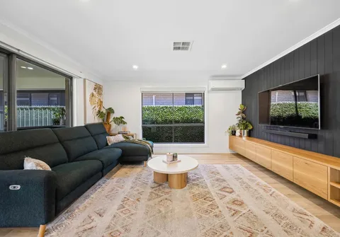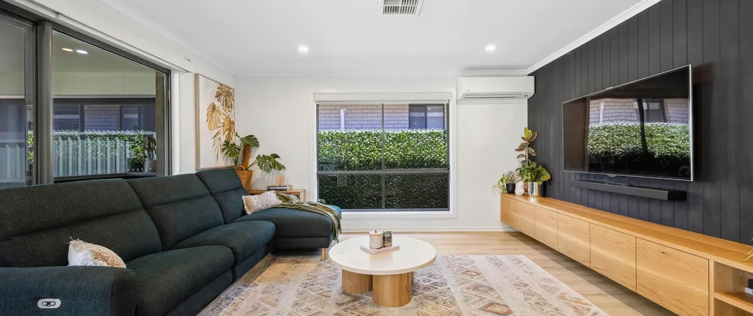 - Stylish living area with feature wall, built-in TV unit and split system air conditioning