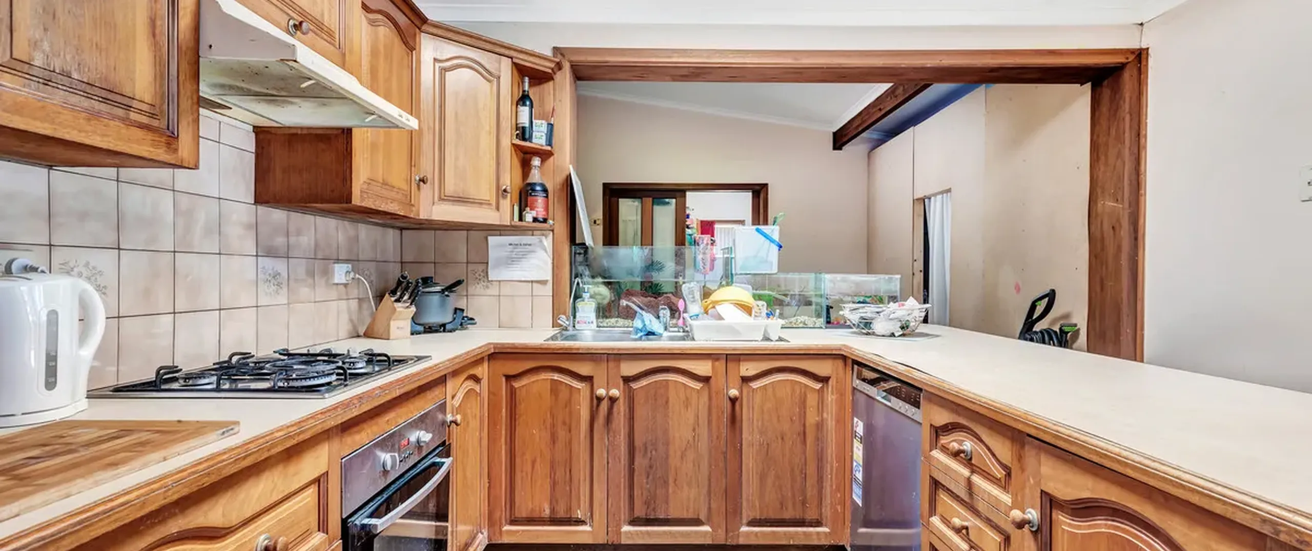 - Timber kitchen with breakfast bar, gas cooktop and dishwasher