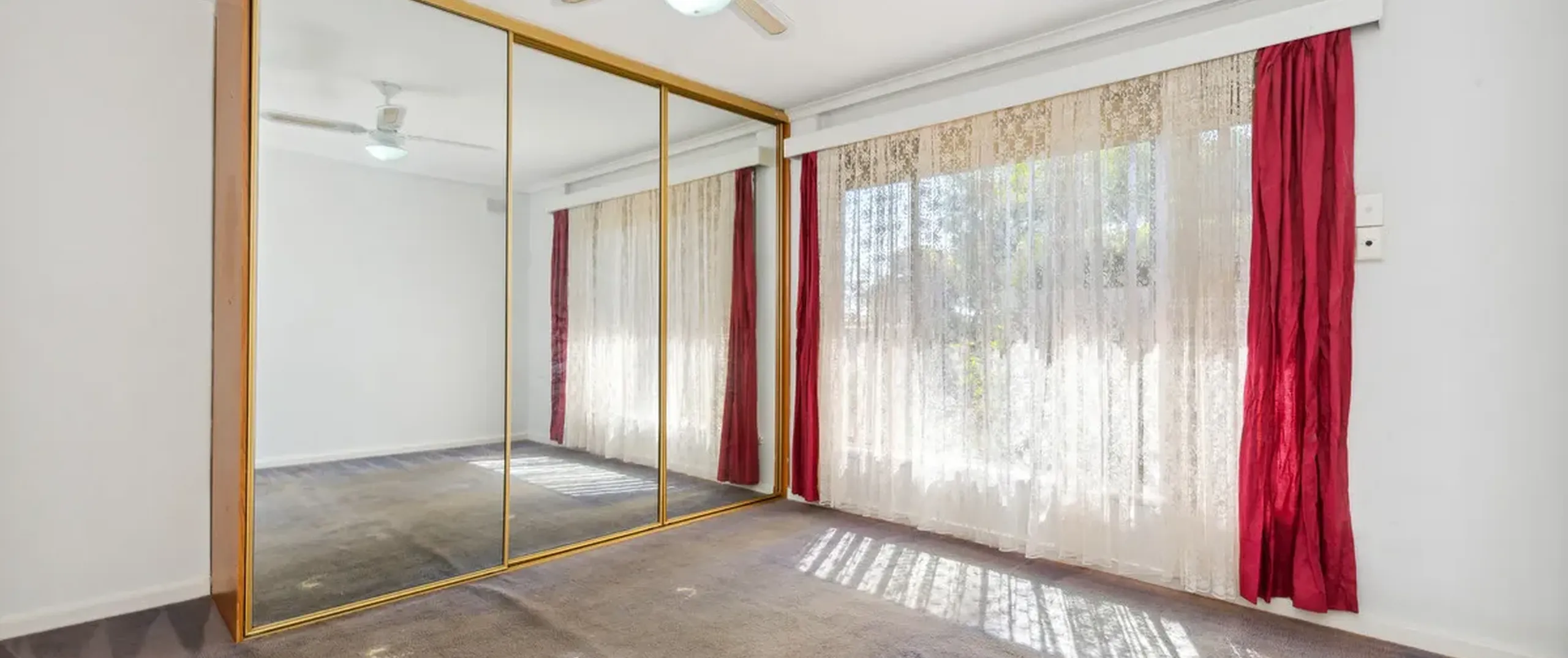 - Large master bedroom with mirrored built-in robe and ceiling fan