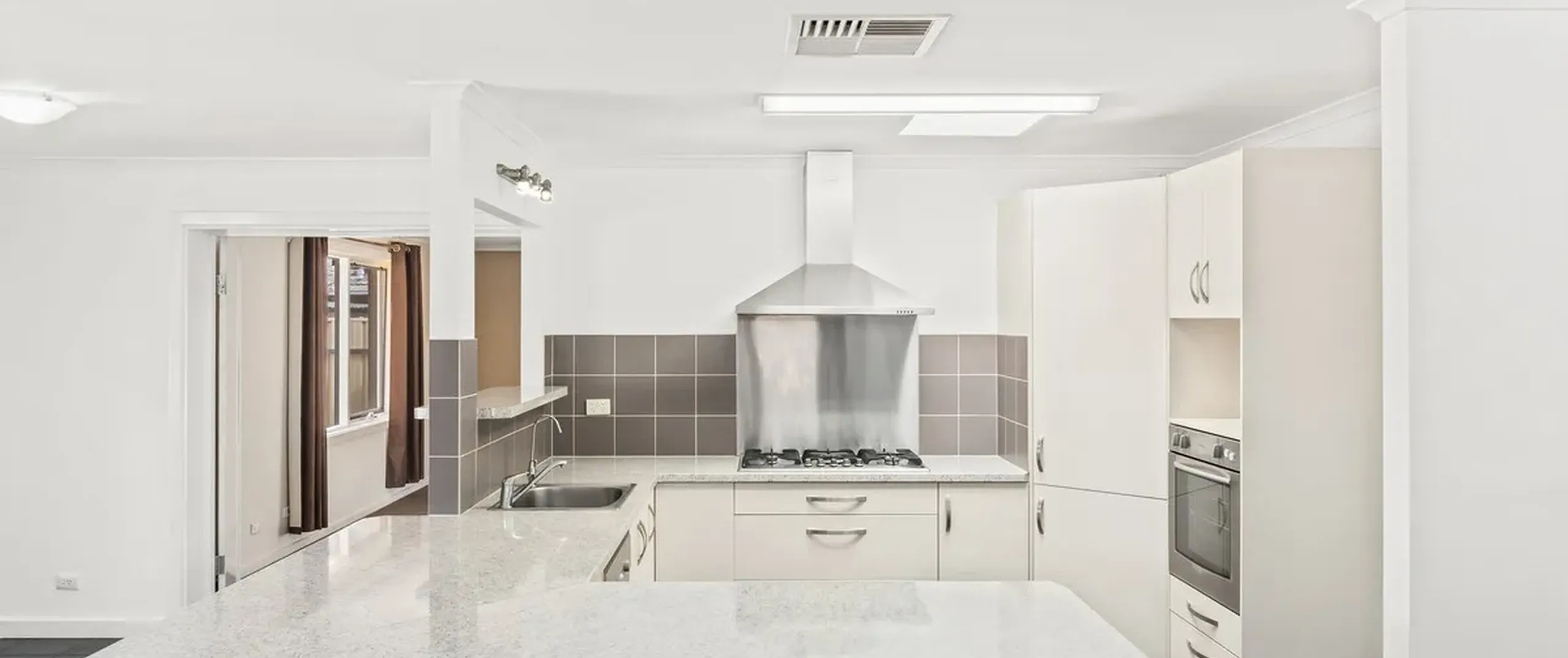 - Modern kitchen with gas cooking, dishwasher, pantry storage, expansive bench space, breakfast bar