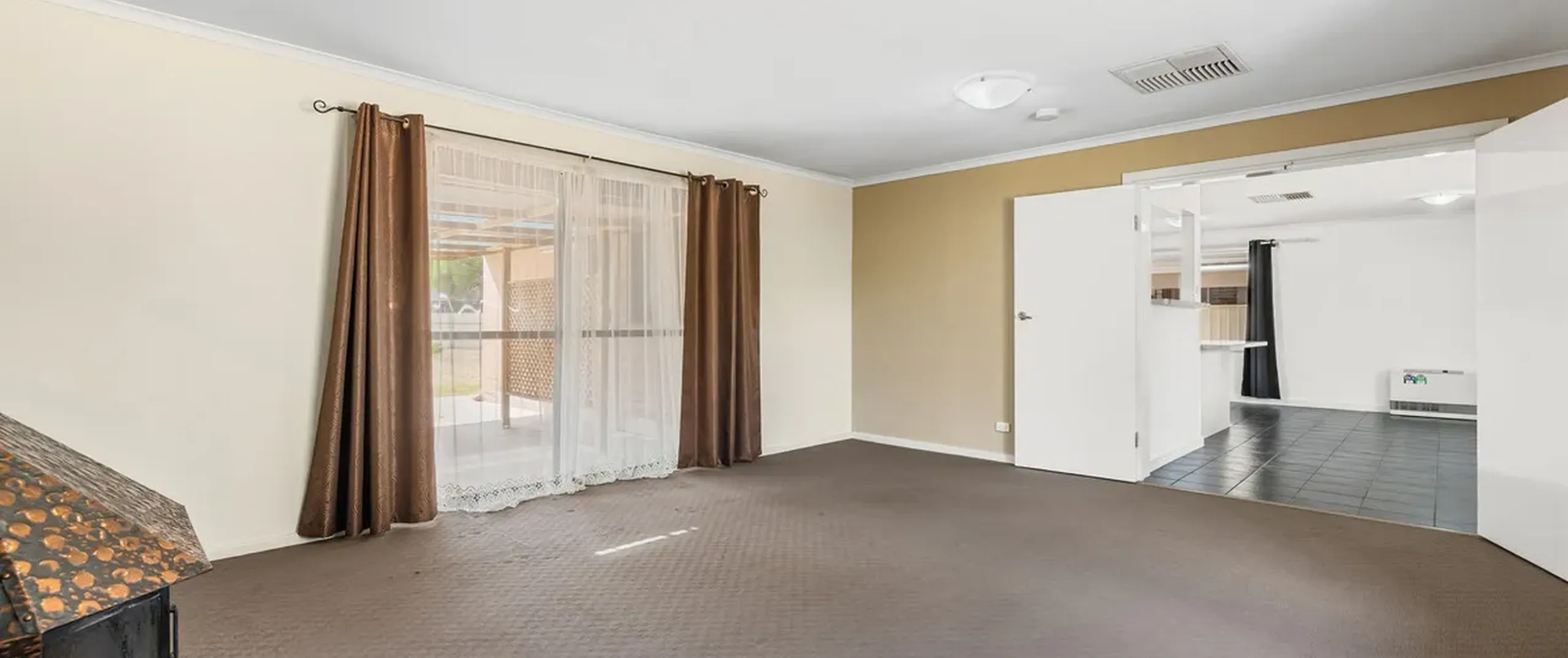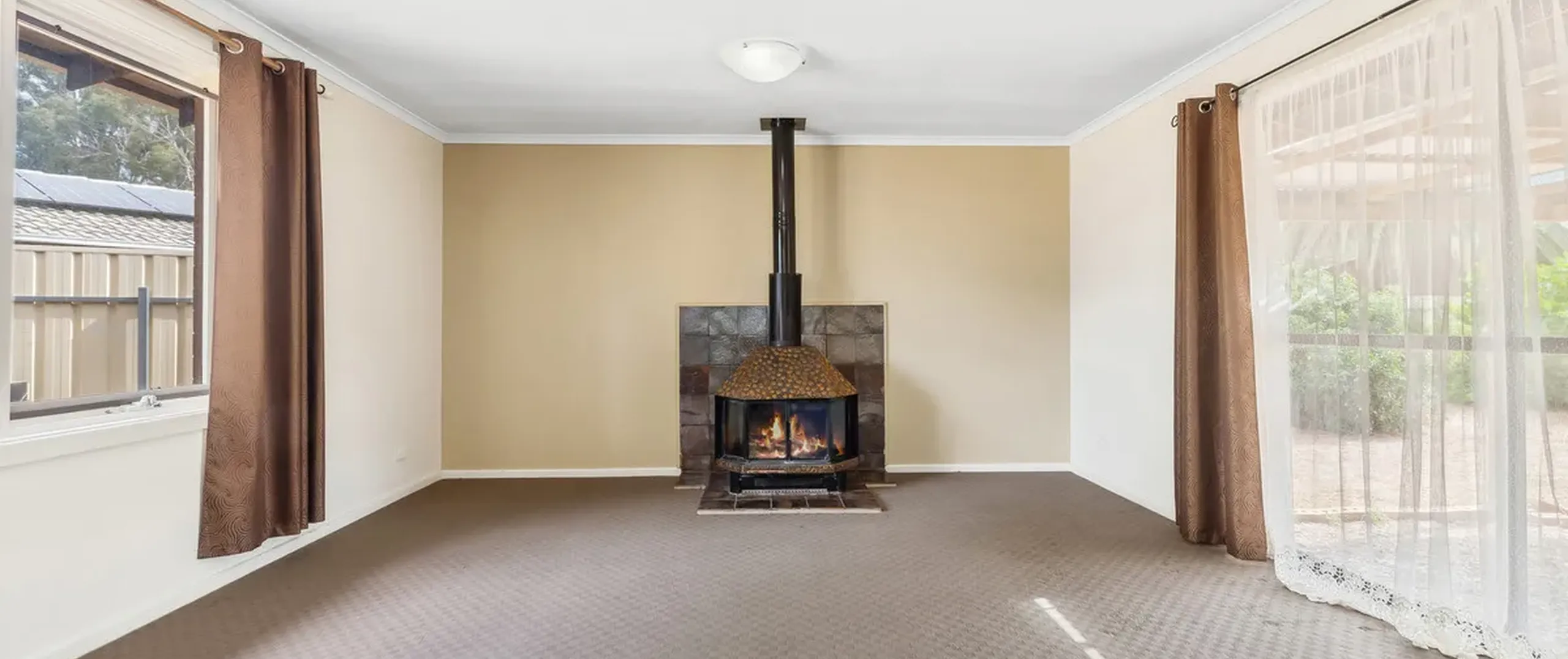 - Large carpeted lounge with a cosy focal-point wood fire