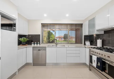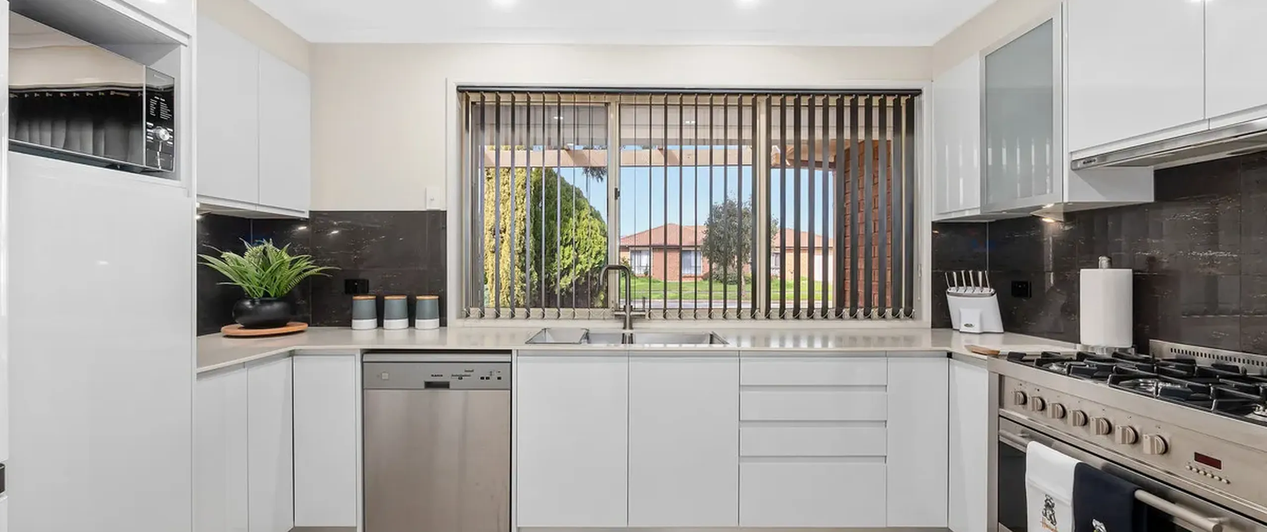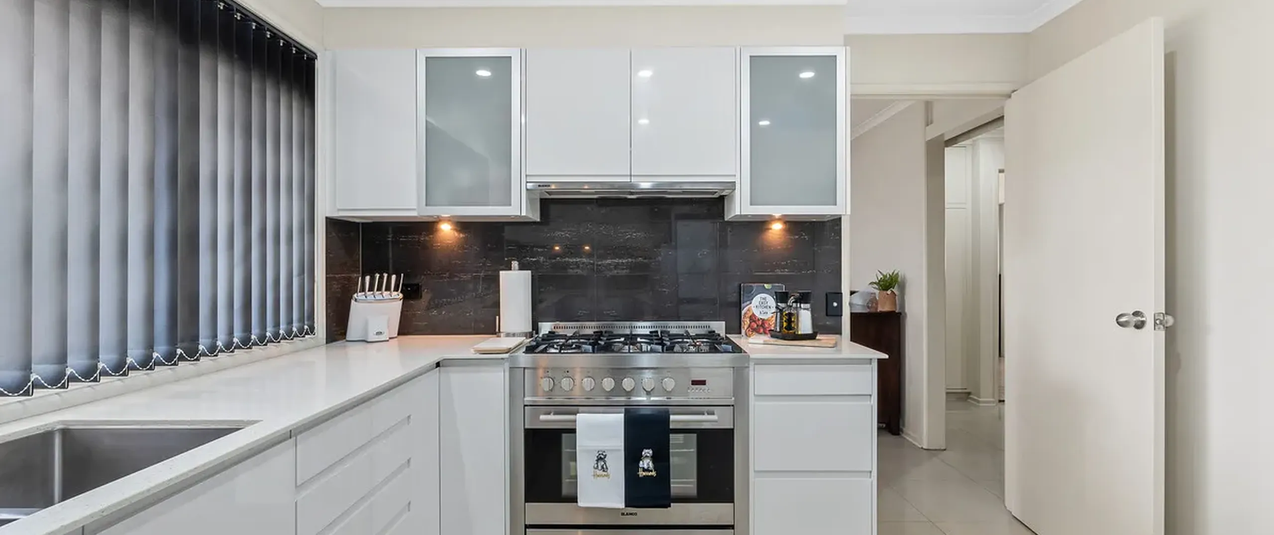 - Stylish contemporary kitchen with 2 pac cabinetry and stone benchtops, stainless steel appliances including a dishwasher, Blanco gas oven and 5 burner cooktop, 2x pantries and ample cupboard and bench space