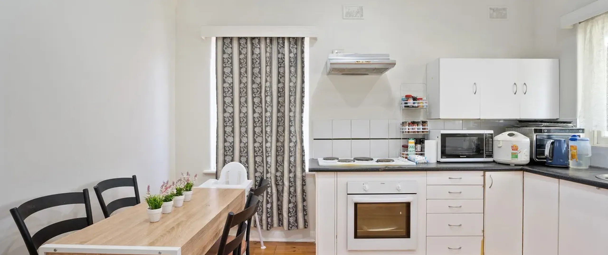 - Functional eat-in kitchen with ample cupboard and bench space and direct external access