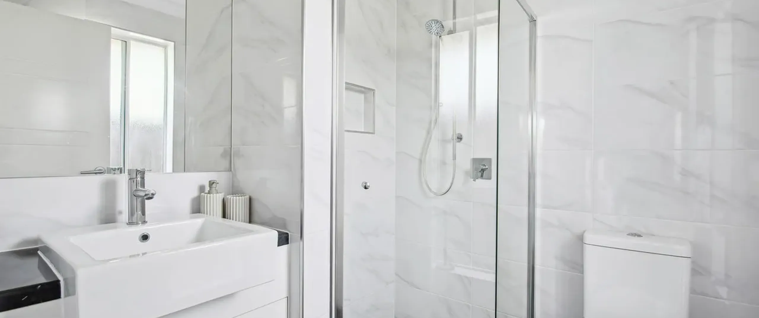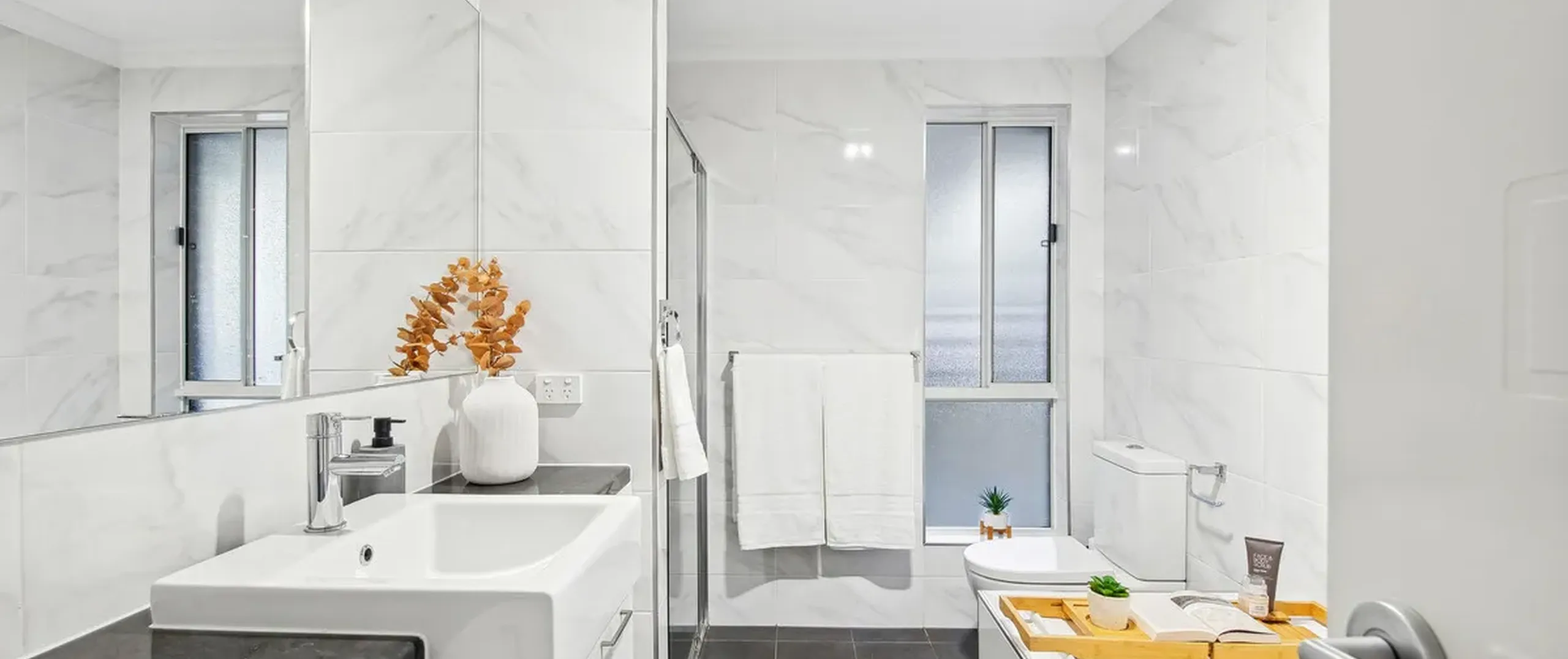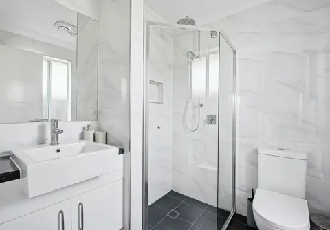- Contemporary main bathroom with floor to ceiling marble look tiles, bath, shower and toilet