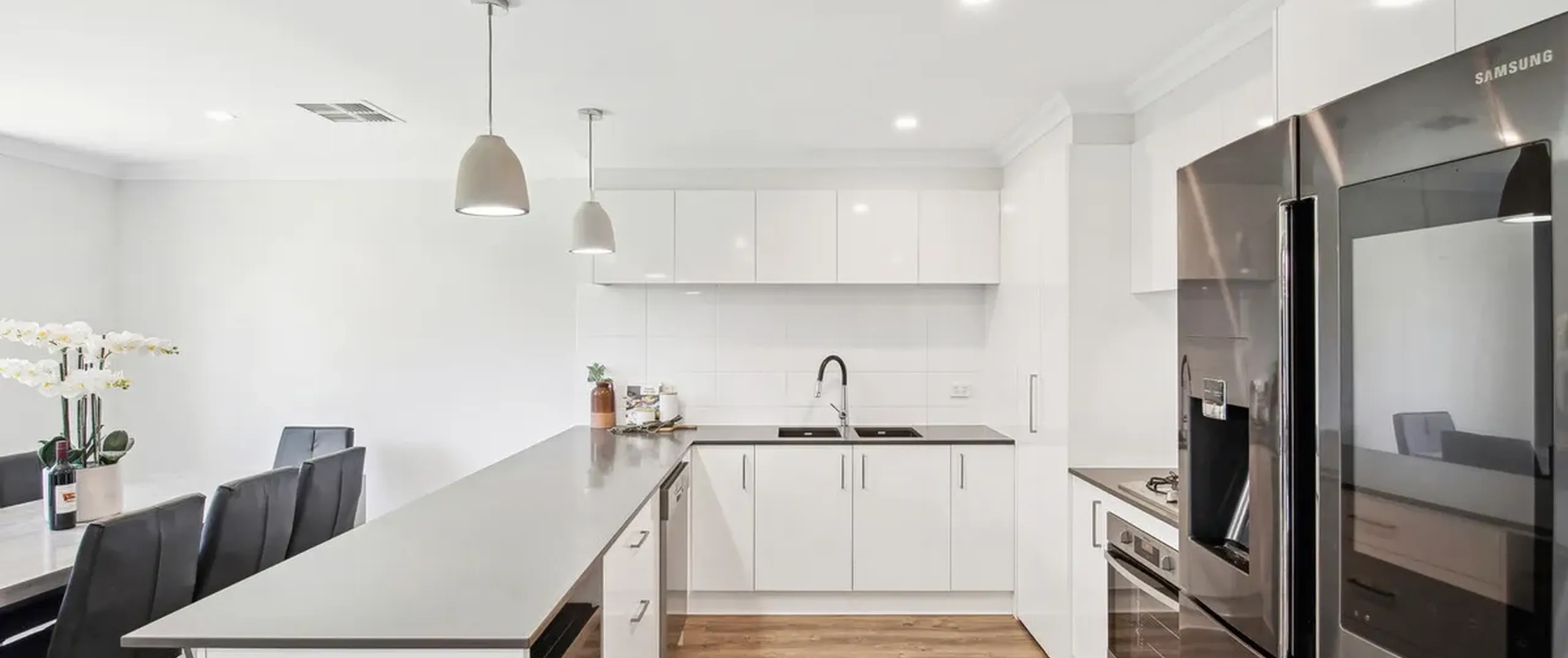 - Chic white kitchen with sweeping stone benchtops, dishwasher, gas cook top and breakfast bar