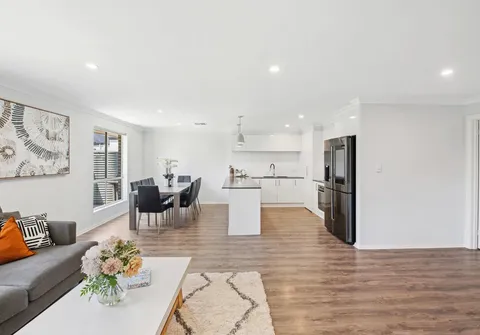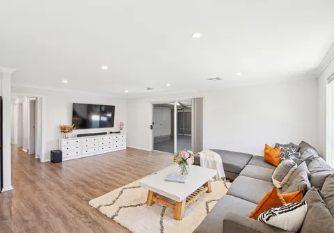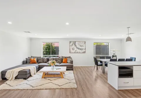 The heart of the home is the light-filled open-plan family and dining area, perfectly complemented by large windows that bathe the space in natural light. At its center is the sleek, timeless kitchen featuring stone benchtops, a gas cooktop, and ample storage – ready to inspire your culinary creations.