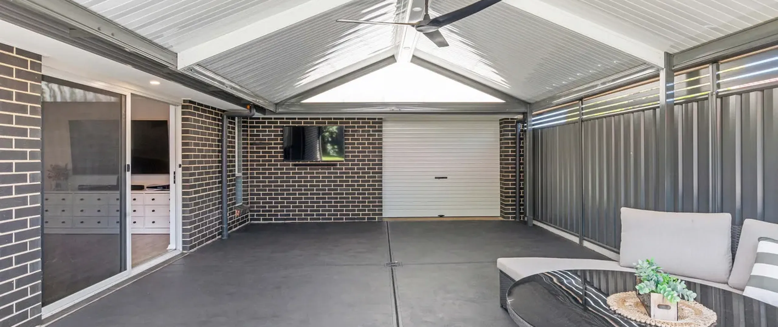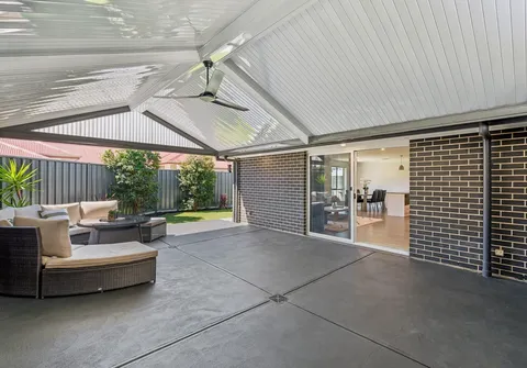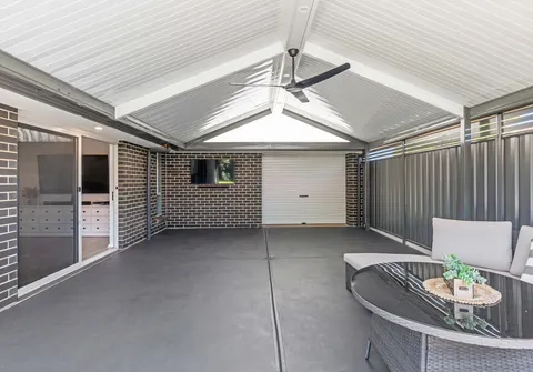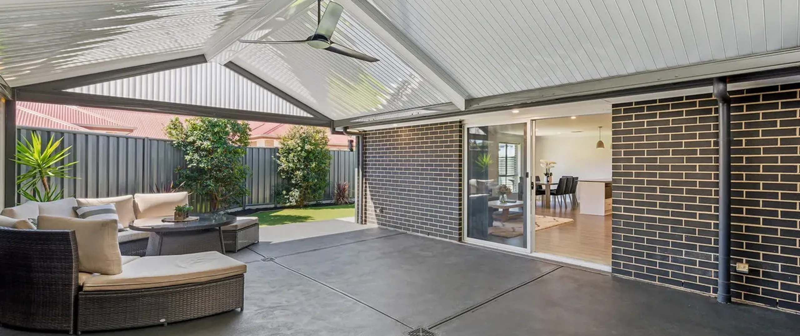 - Impressive outdoor entertaining area with pitched roof pergola with ceiling fan