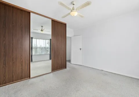 - Bedroom 1 with ceiling fan, air conditioner and large built-in robe