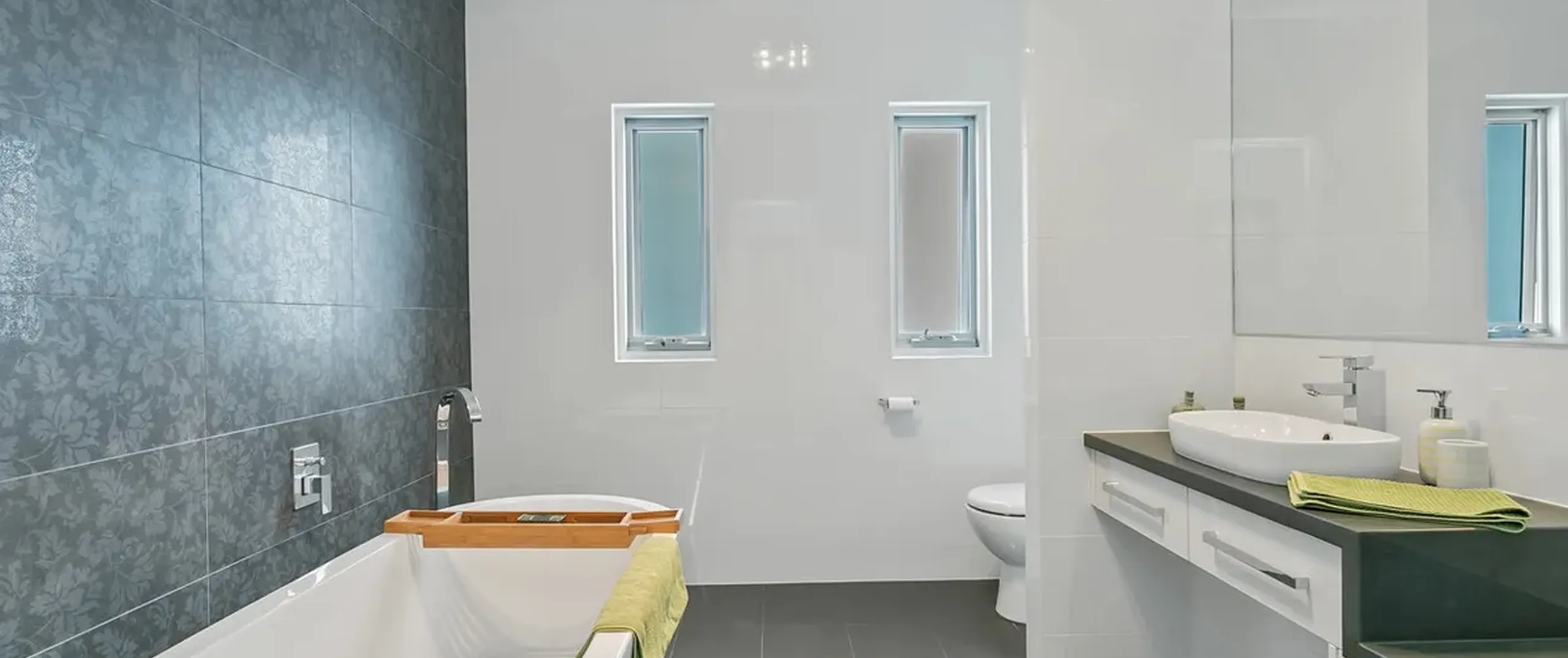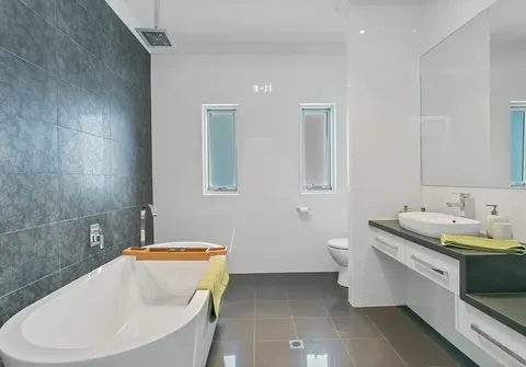 - Sparkling main bathroom with freestanding designer bath and caesar stone benches