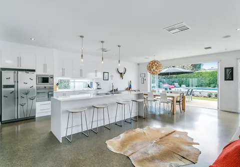 - Stylish kitchen with Bosch and Smeg stainless steel appliances, gas cooking, butler’s pantry, Essastone island bench and dishwasher
