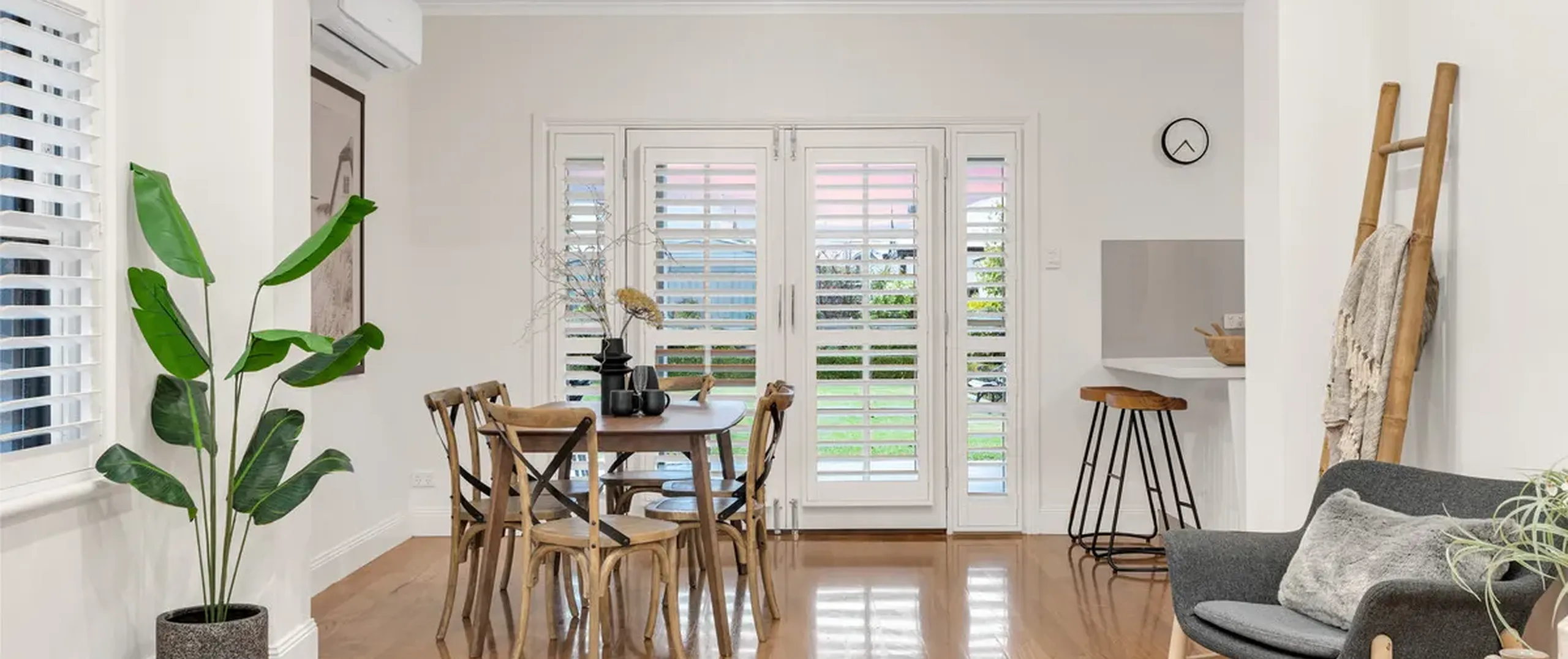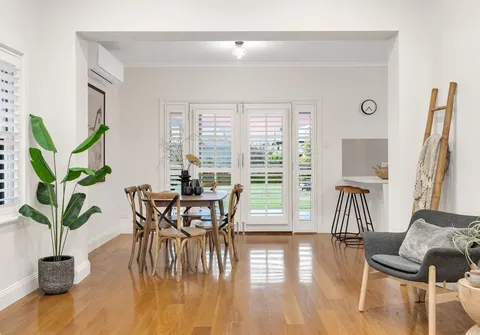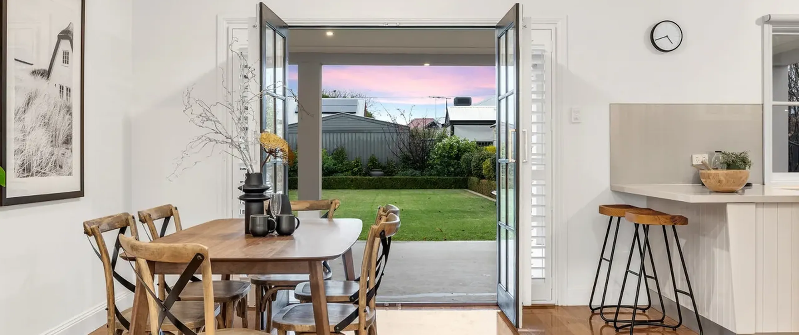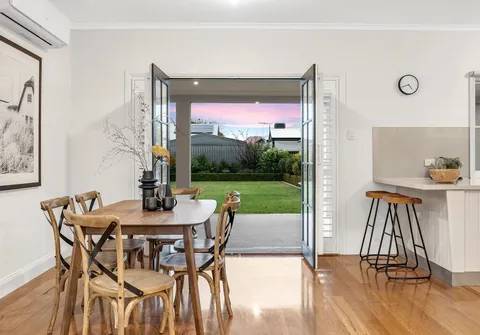 - Light filled dining with split system air conditioner and double doors leading to outdoor entertaining