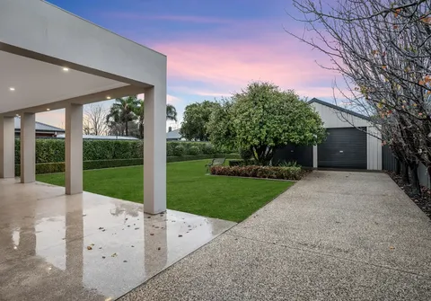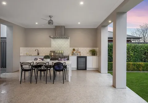 The kitchen, dining and living room is spacious and light-filled with double doors that step out to the covered entertaining area. Here, you can host friends and family around the built-in outdoor kitchen and barbeque or simply relax and admire views over the manicured backyard.