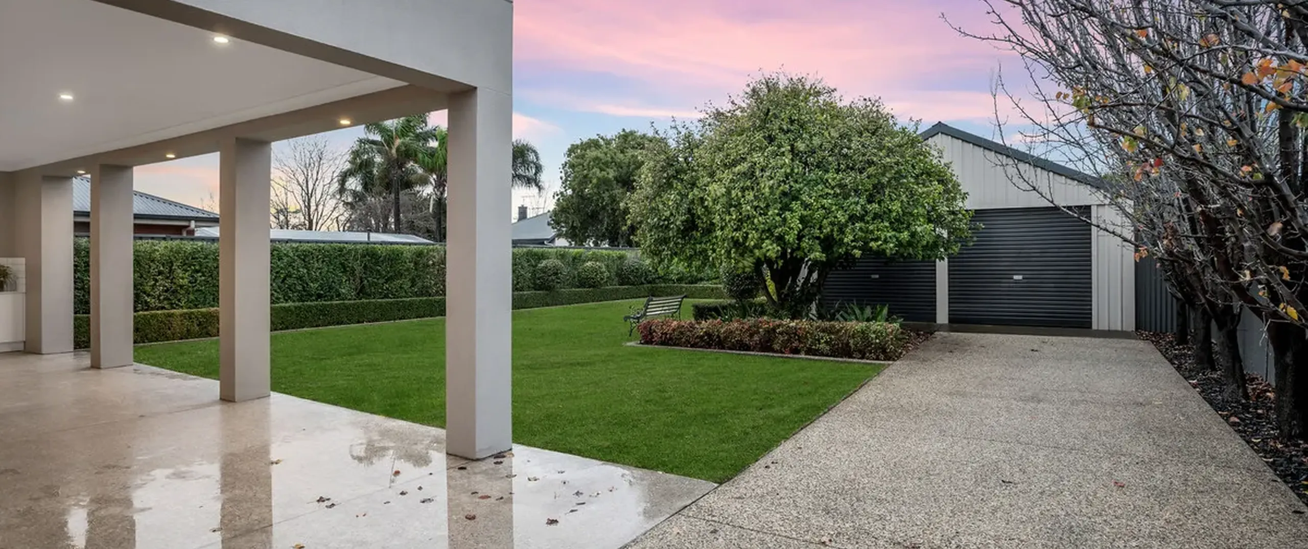 - Double length carport with roller door and drive through access to double garage with roller doors and power