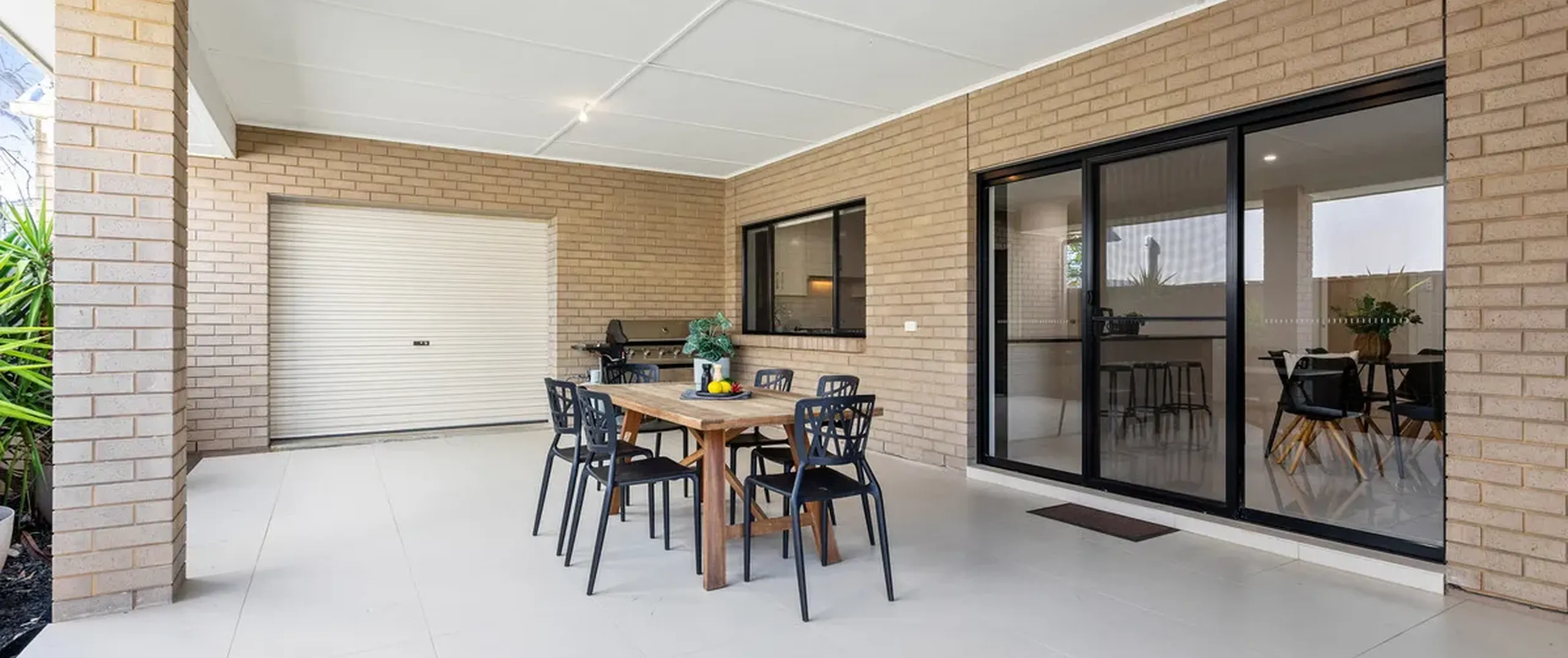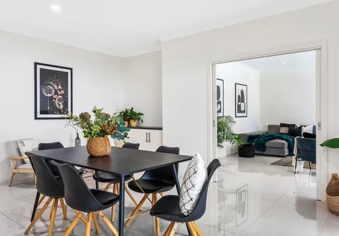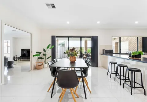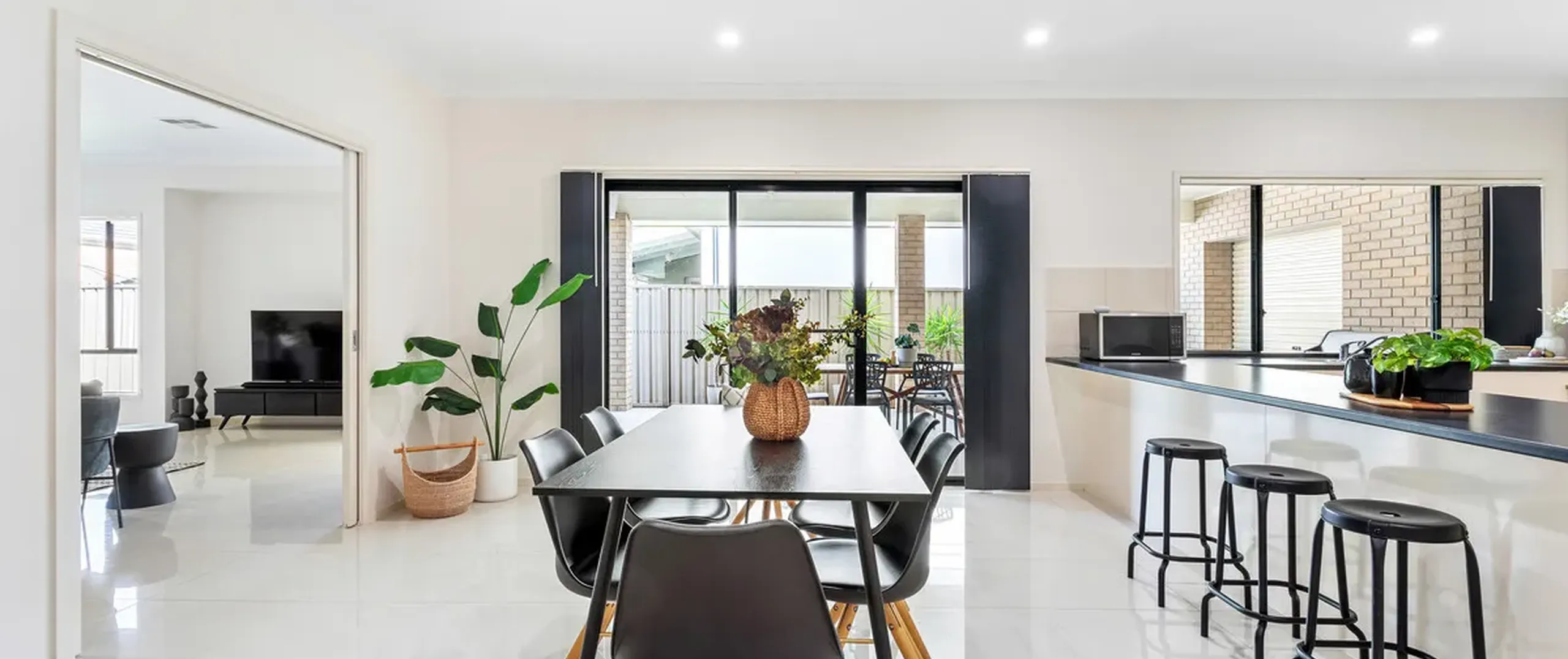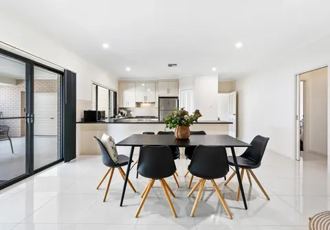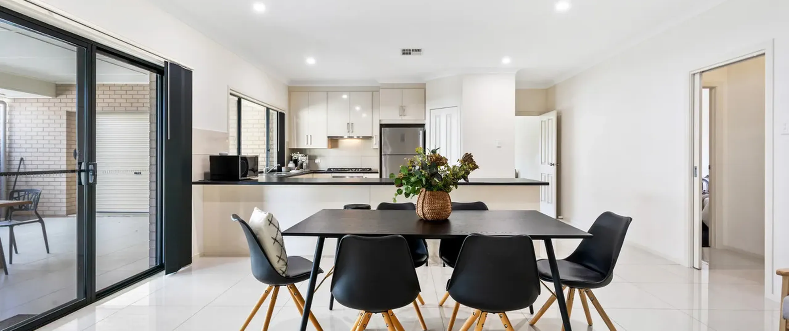 - Open plan dining adjacent kitchen with built-in cupboards and sliding door to outdoor entertaining area