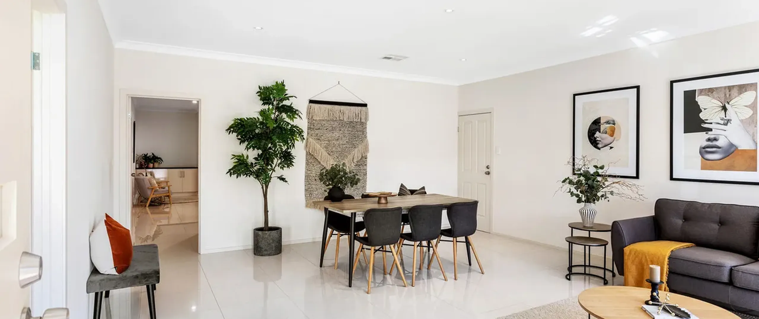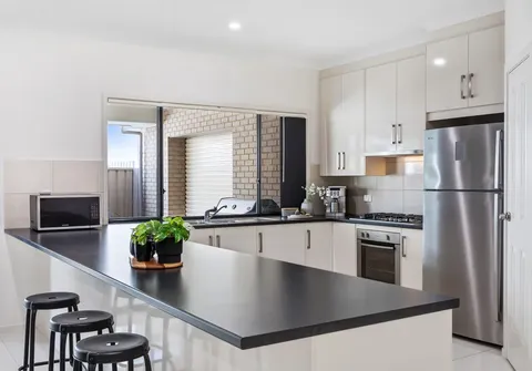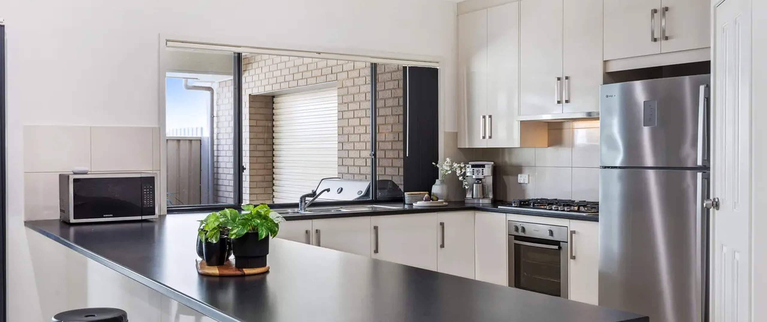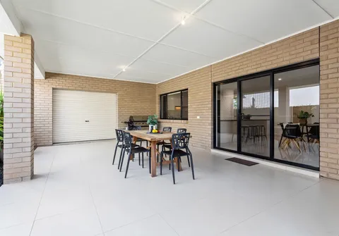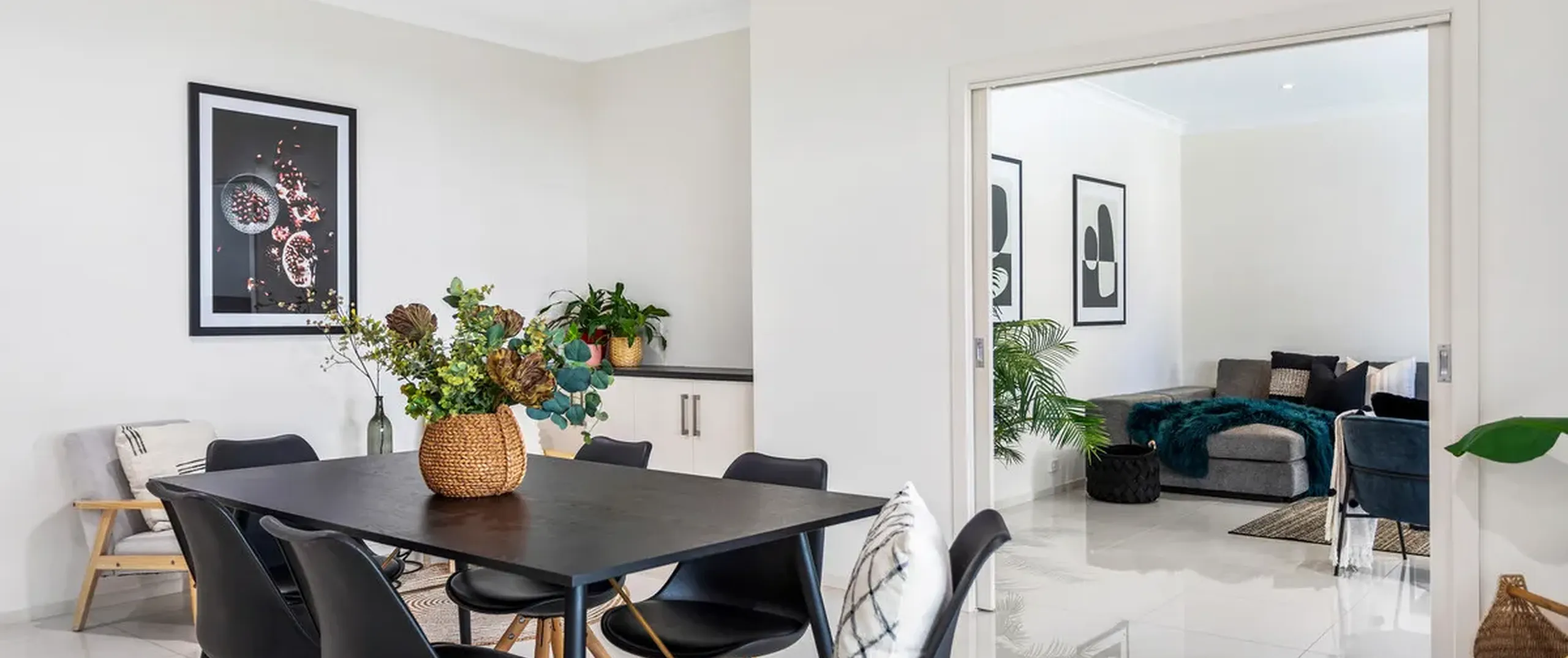 - Open plan dining adjacent kitchen with built-in cupboards and sliding door to outdoor entertaining area