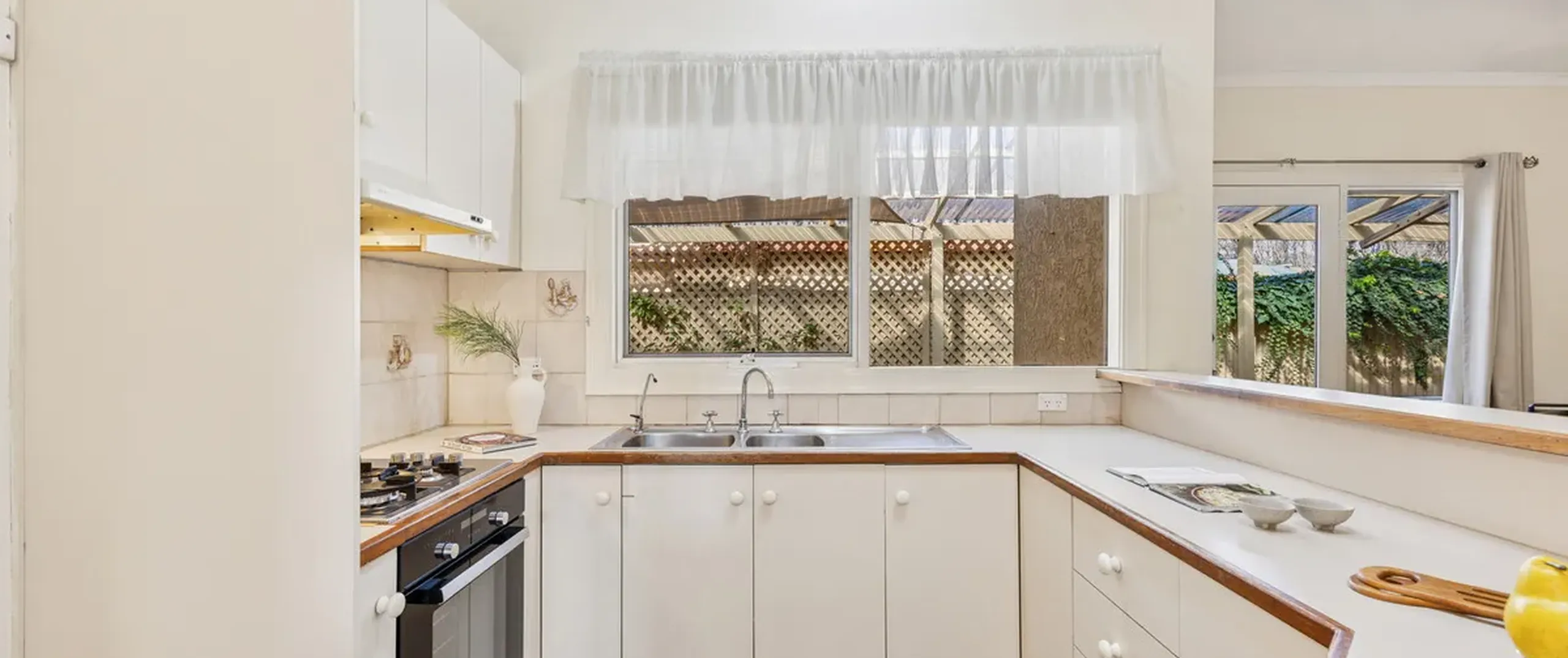 - Kitchen with gas cooktop, oven and ample cupboard and bench space