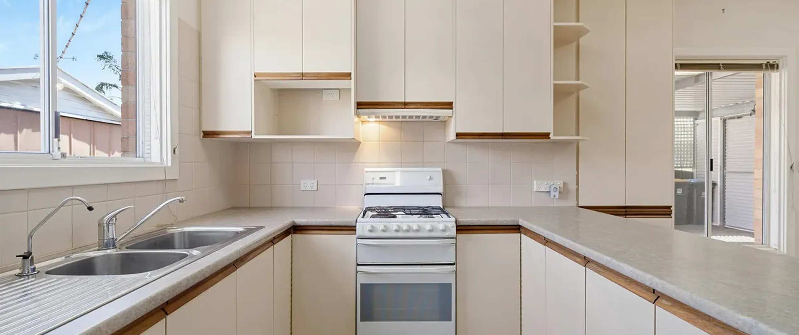 - A retro kitchen with ample bench and cupboard space, breakfast bar, pantry and freestanding cooker with gas cooktop
