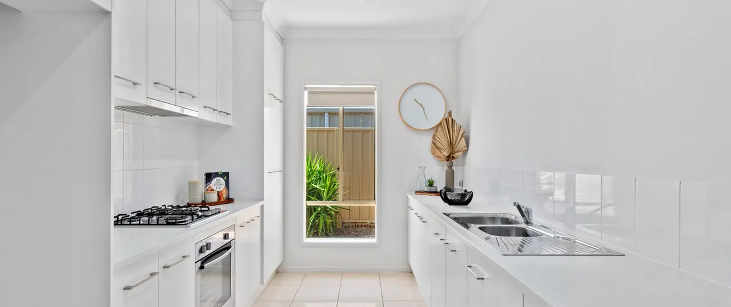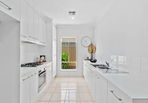 - Stylish white kitchen with stainless steel oven and gas cooktop, ample cupboard and bench space complete with well-sized pantry