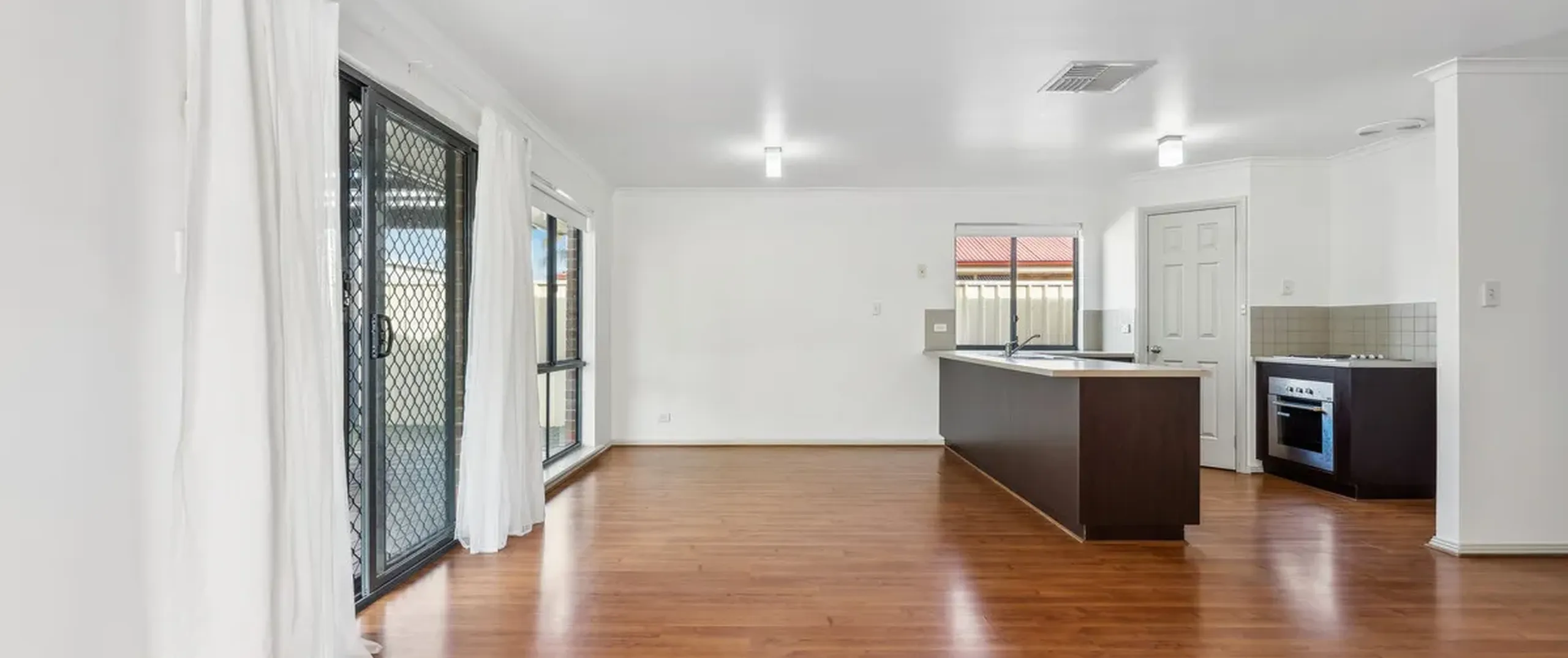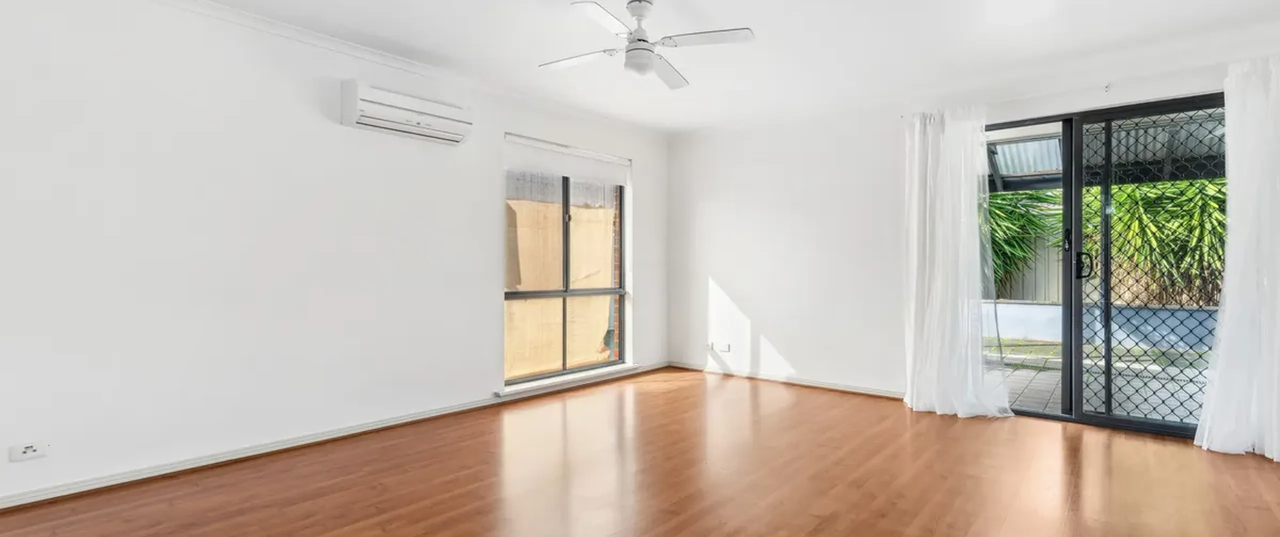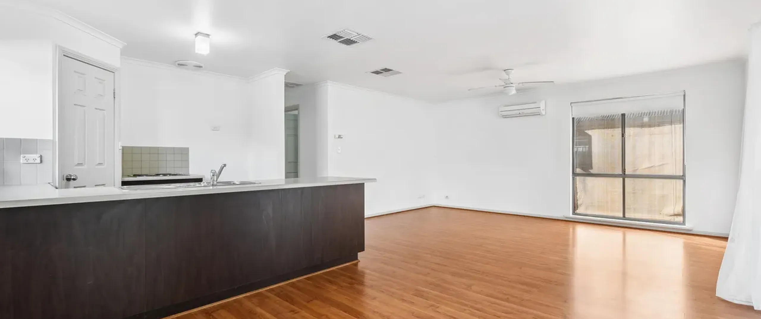 - Large living area with ceiling fan and split system air conditioner is adjacent to the kitchen and dining