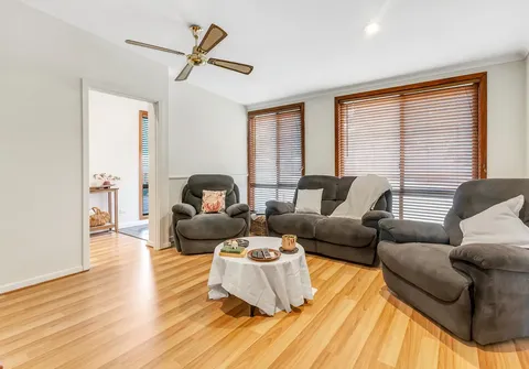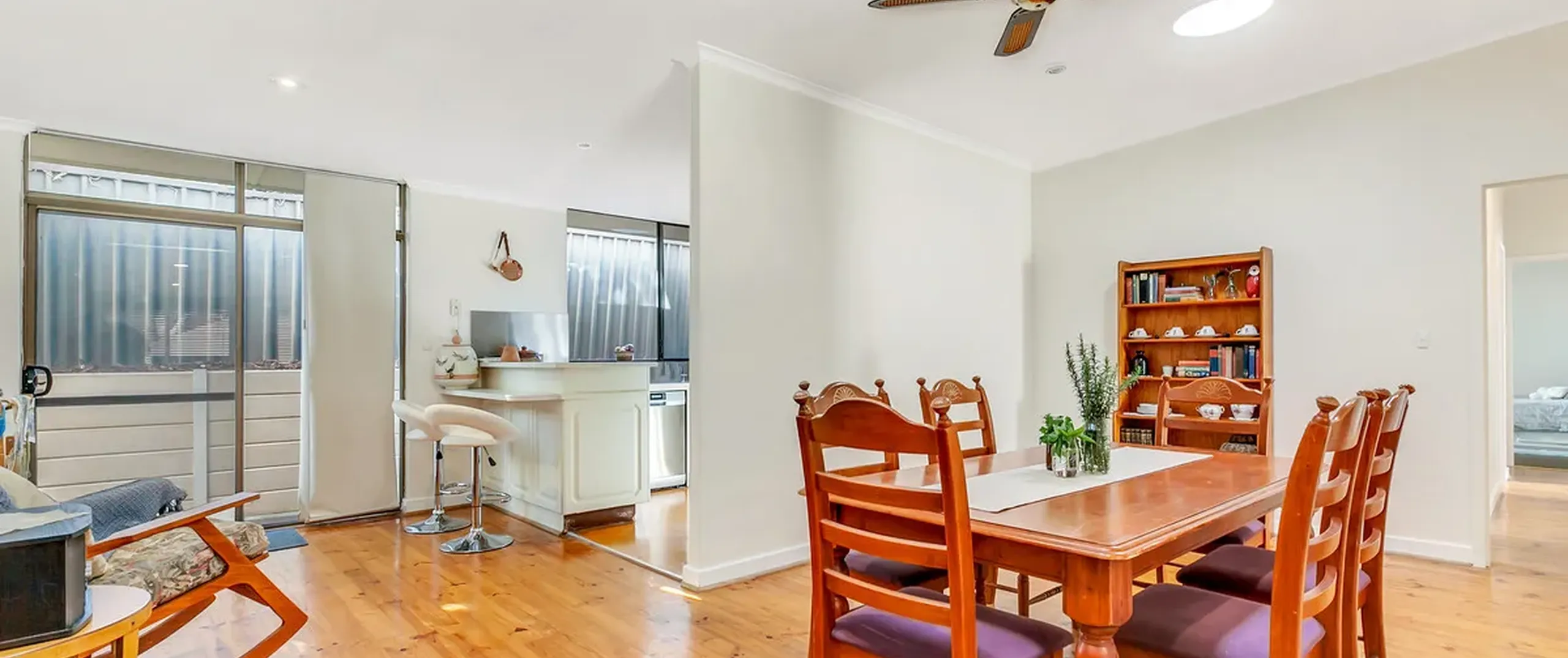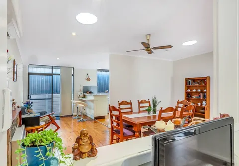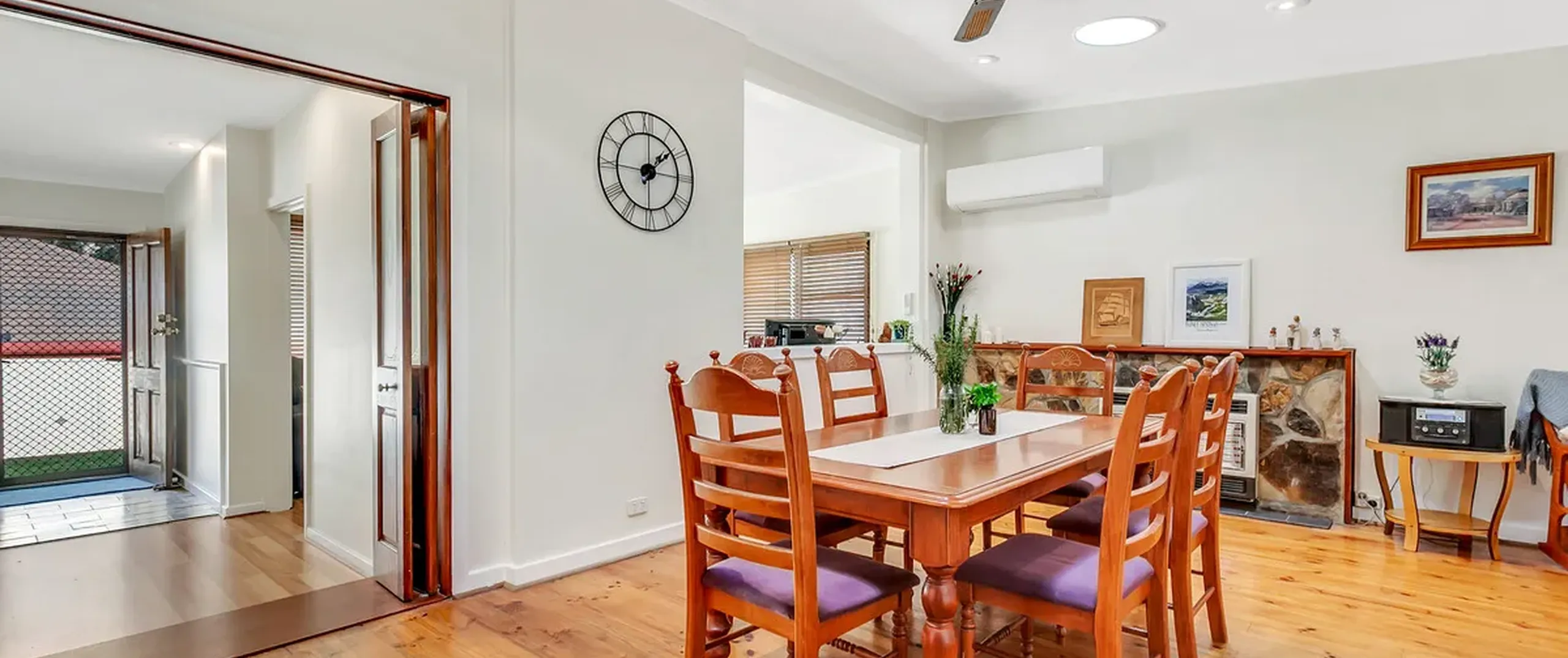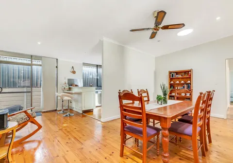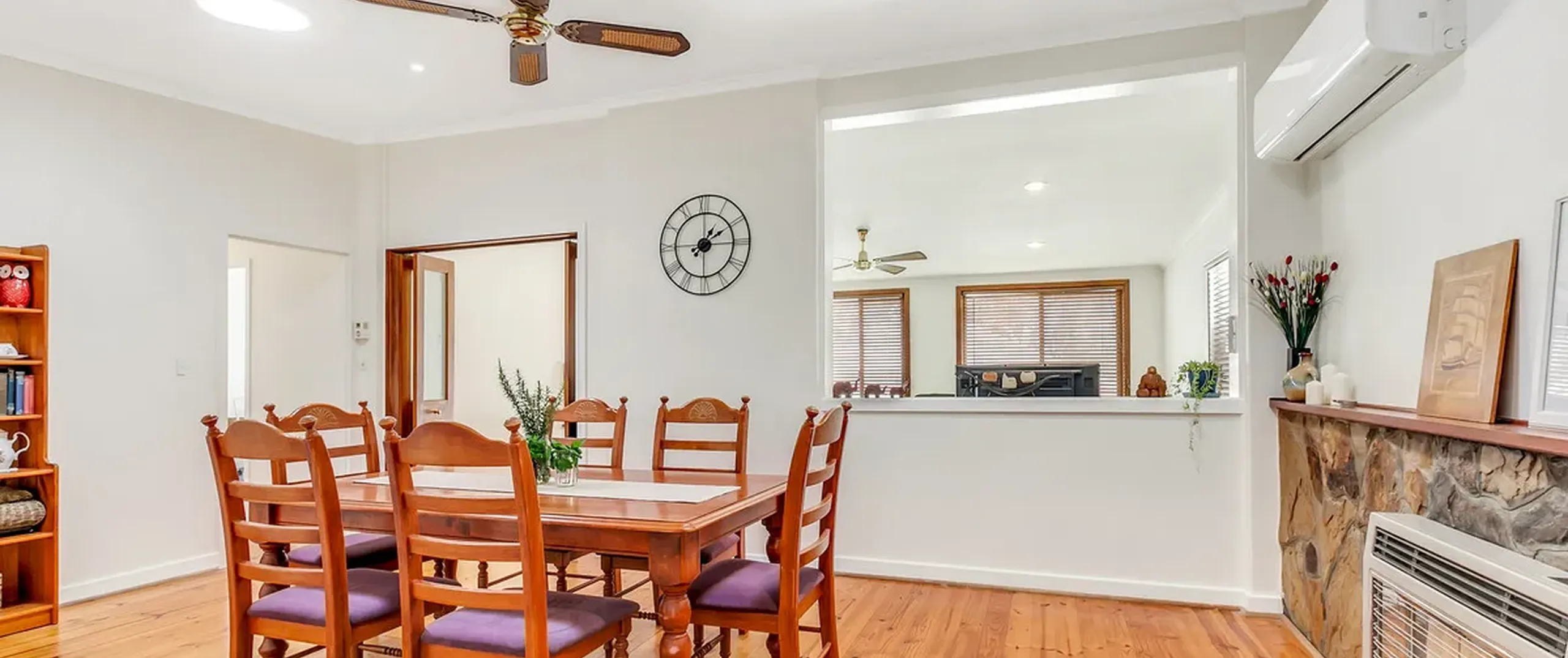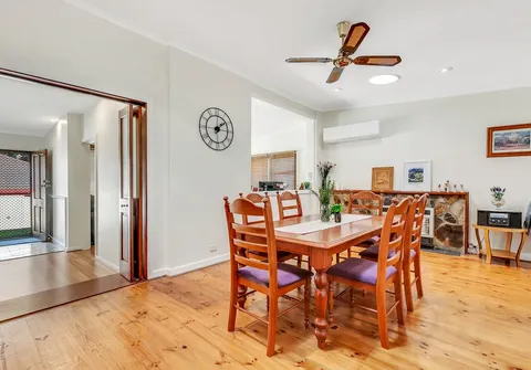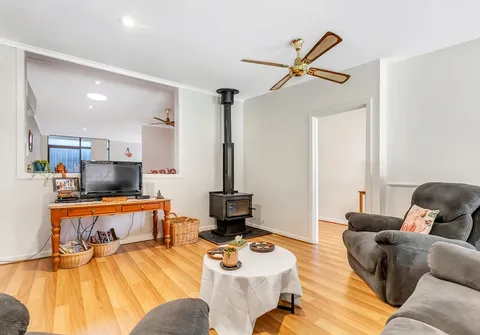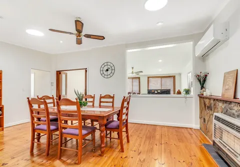- Light filled open plan family/dining area with combustion wood heater, gas heater, ceiling fan and split-system air conditioner