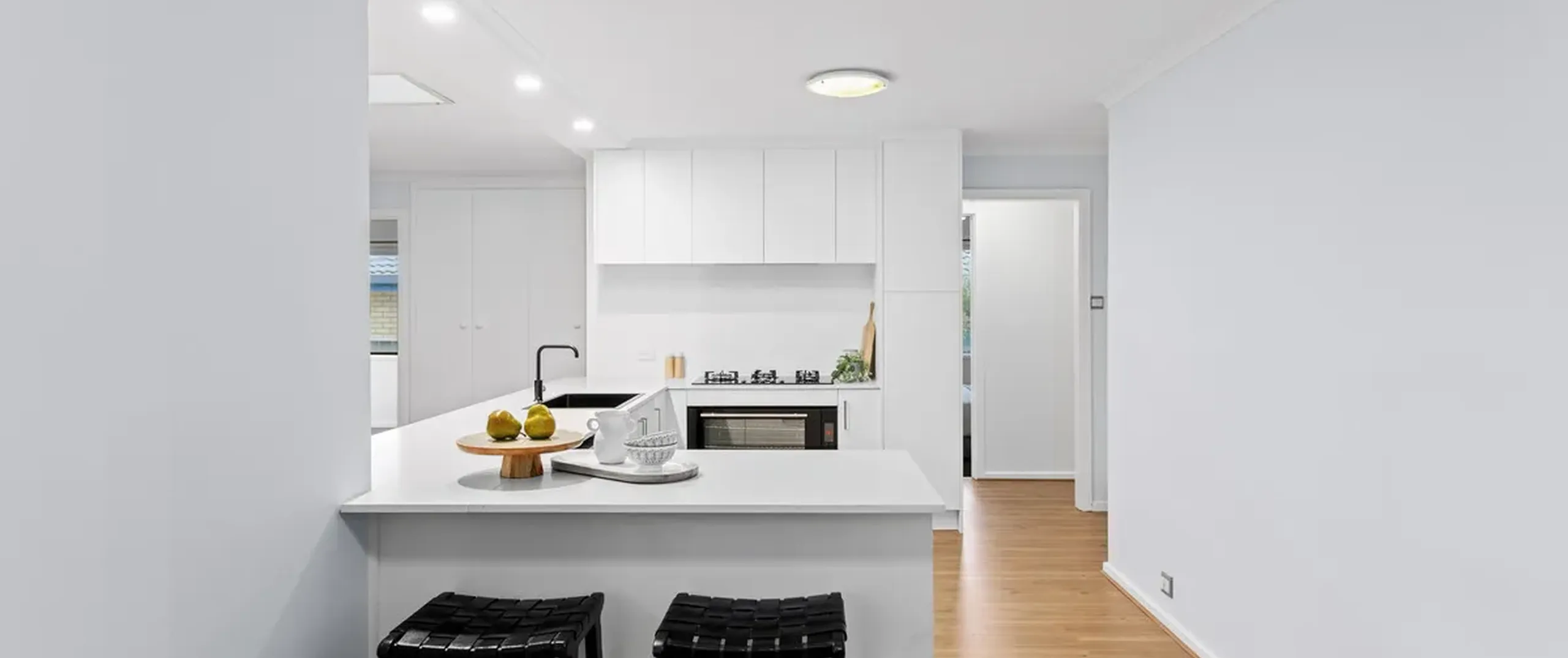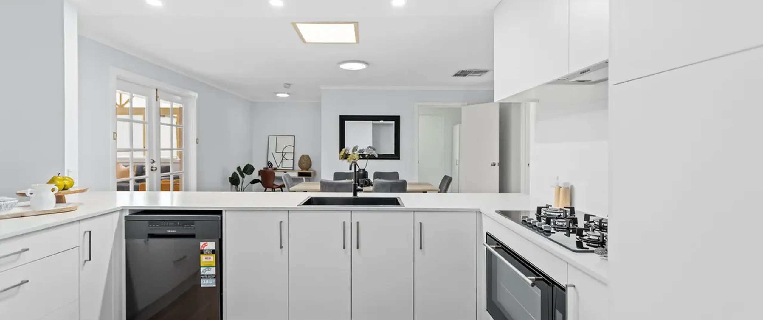 - Modern kitchen featuring ample cupboard and bench space, stainless steel appliances and servery to the dining room