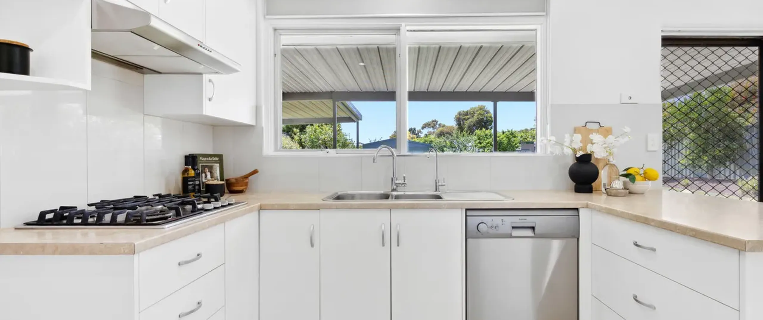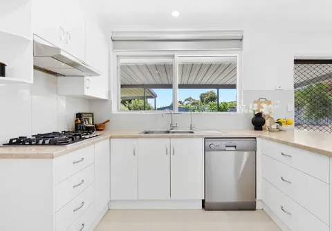 - Modern kitchen with abundance of cupboard and bench space, gas cooktop, dishwasher and breakfast bar; complete with large window overlooking the backyard