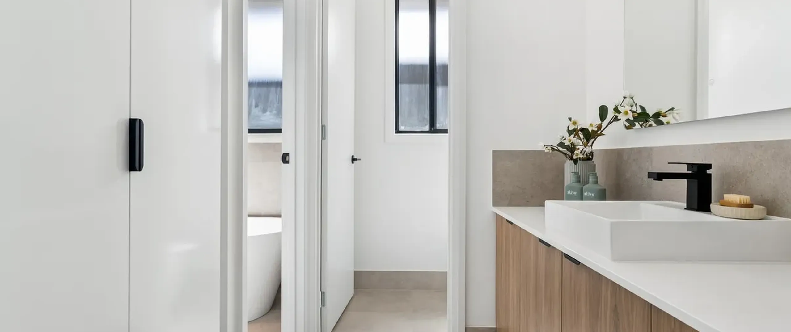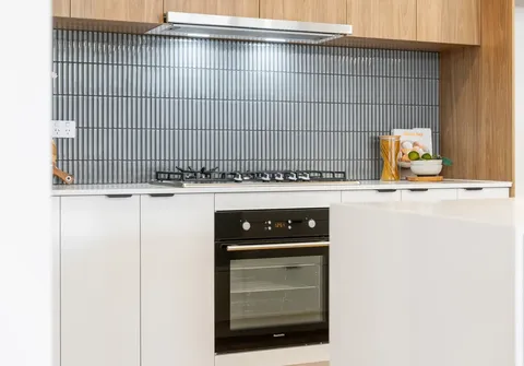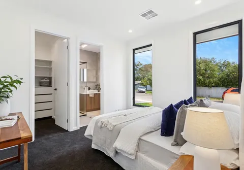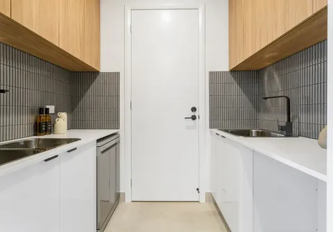 The heart of the home is the open-plan living area, where the striking kitchen takes centre stage. Designed for both function and flair, it features a 5-burner cooktop, oven and a sleek island bench with in-built sink and breakfast bar. The adjoining walk-through laundry cleverly doubles as a butler’s pantry, complete with dual sink, dishwasher and abundant storage, ensuring seamless convenience for modern life.