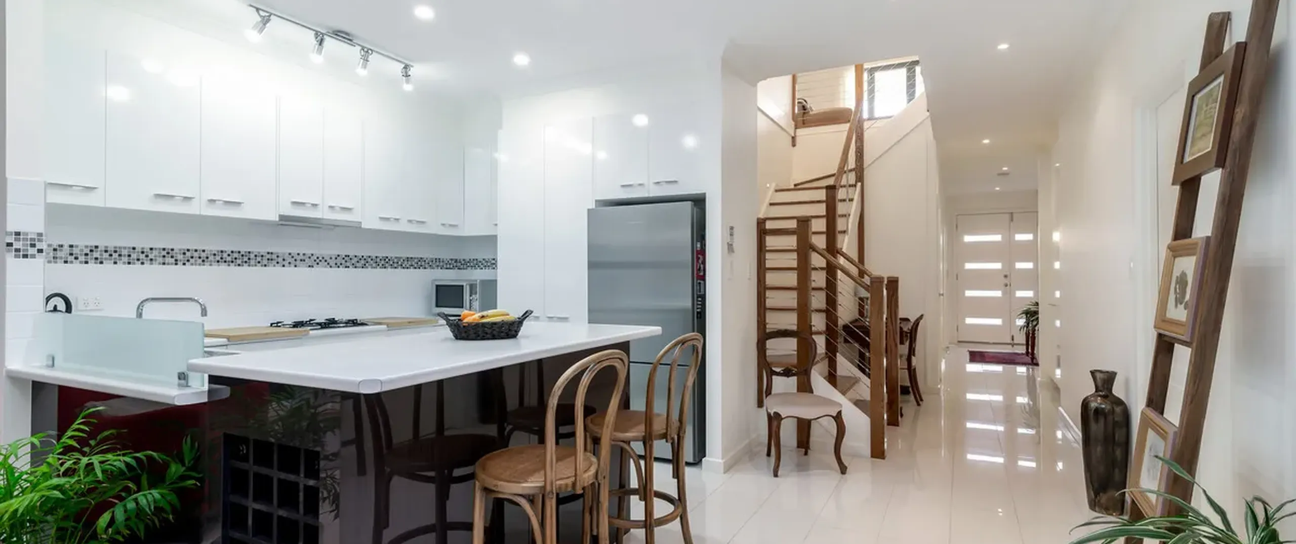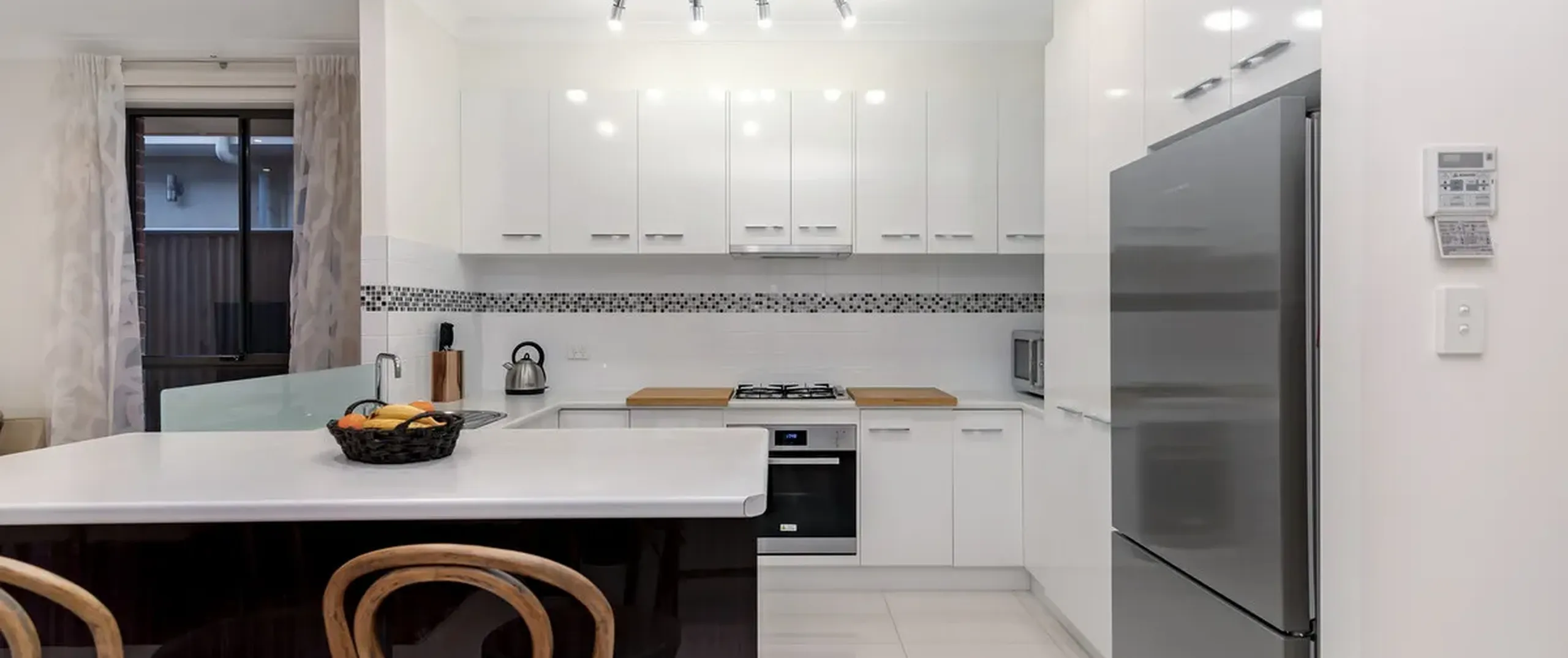 - Modern kitchen with breakfast bar, stainless steel appliances and built-in wine rack