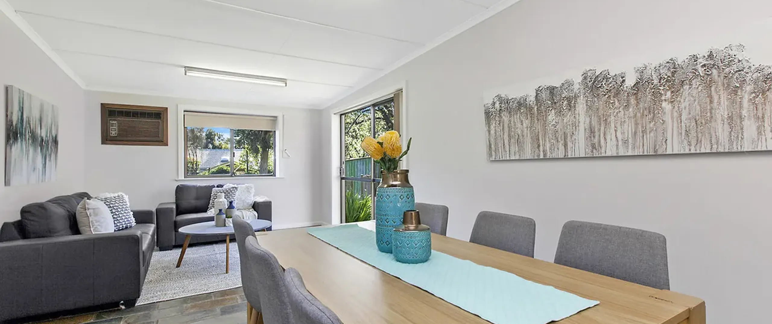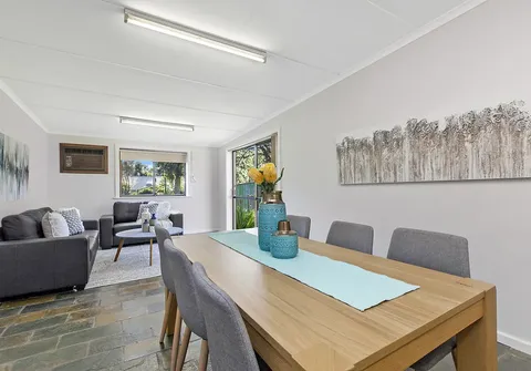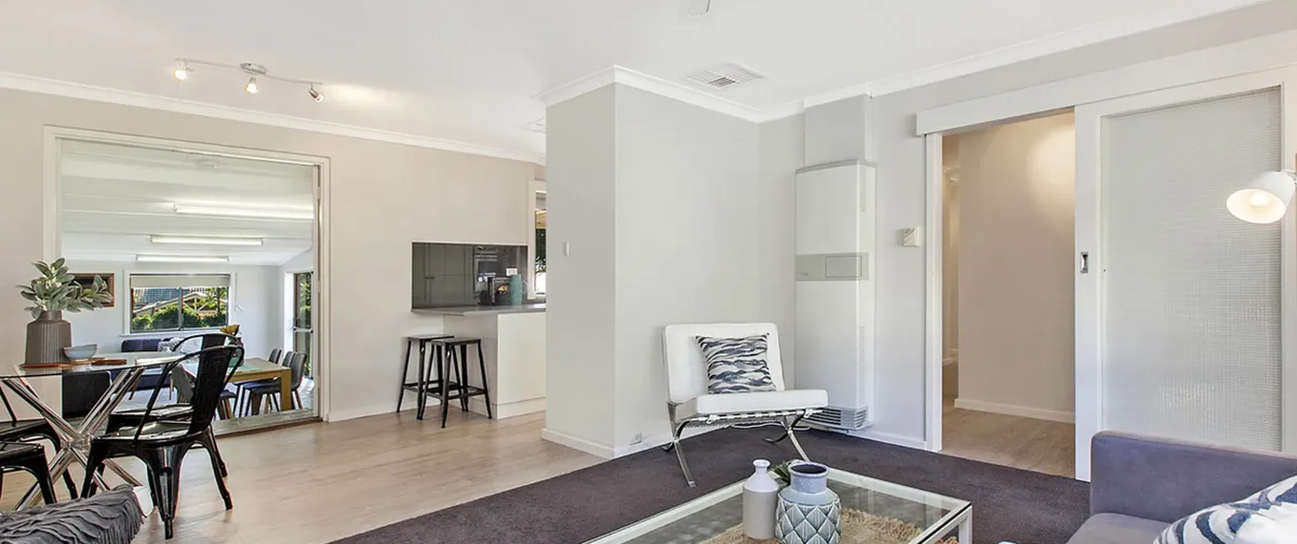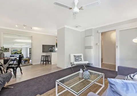 - Light filled living and dining room with ceiling fan and heater