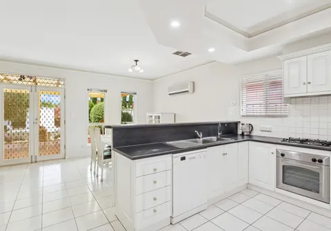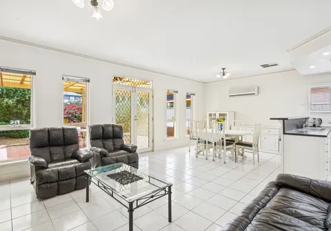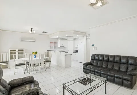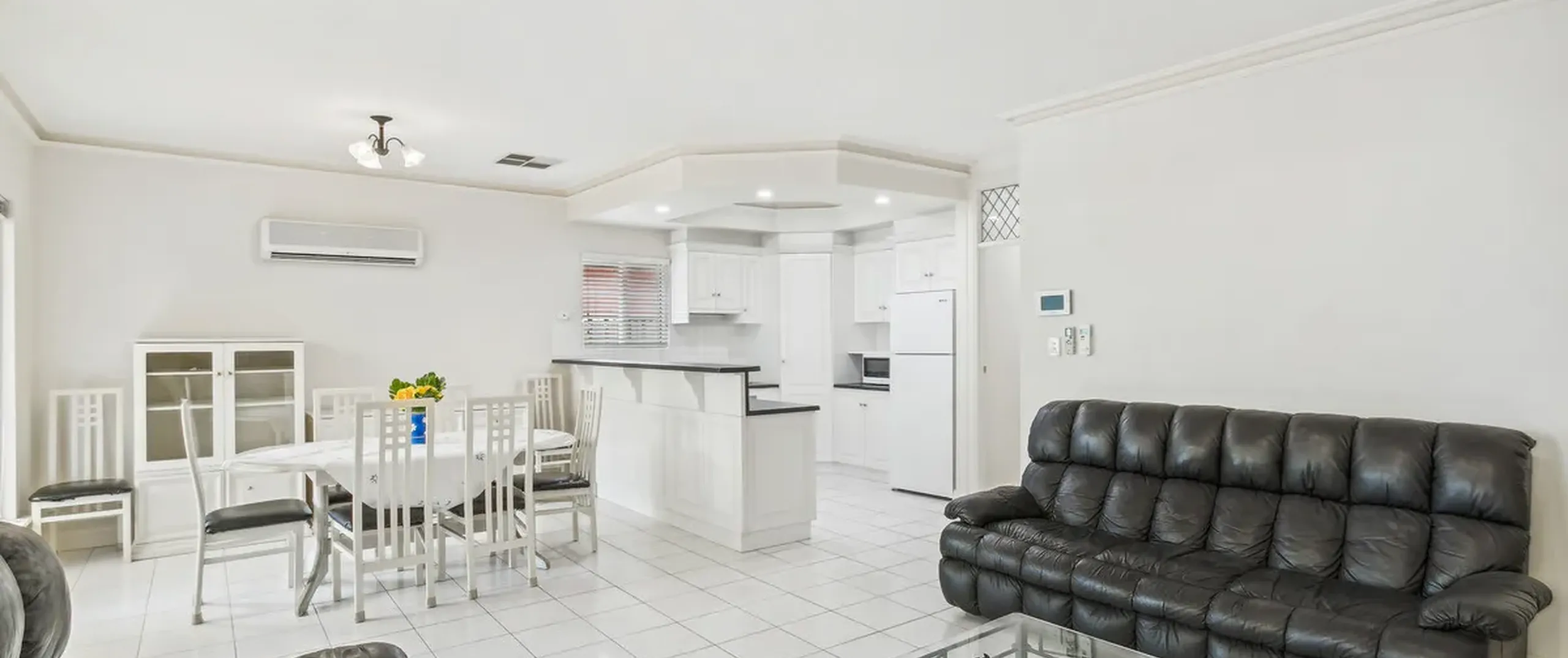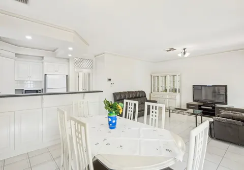 The heart of the home features a well-appointed kitchen, dining, and living area. The kitchen impresses with its sleek white cabinetry, charming bulkhead ceiling, and seamless functionality. This space is further enhanced by elegant floor tiles and a split-system reverse cycle air-conditioner for year-round comfort.