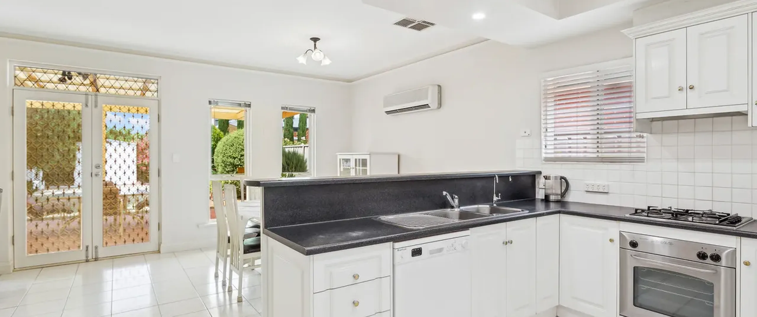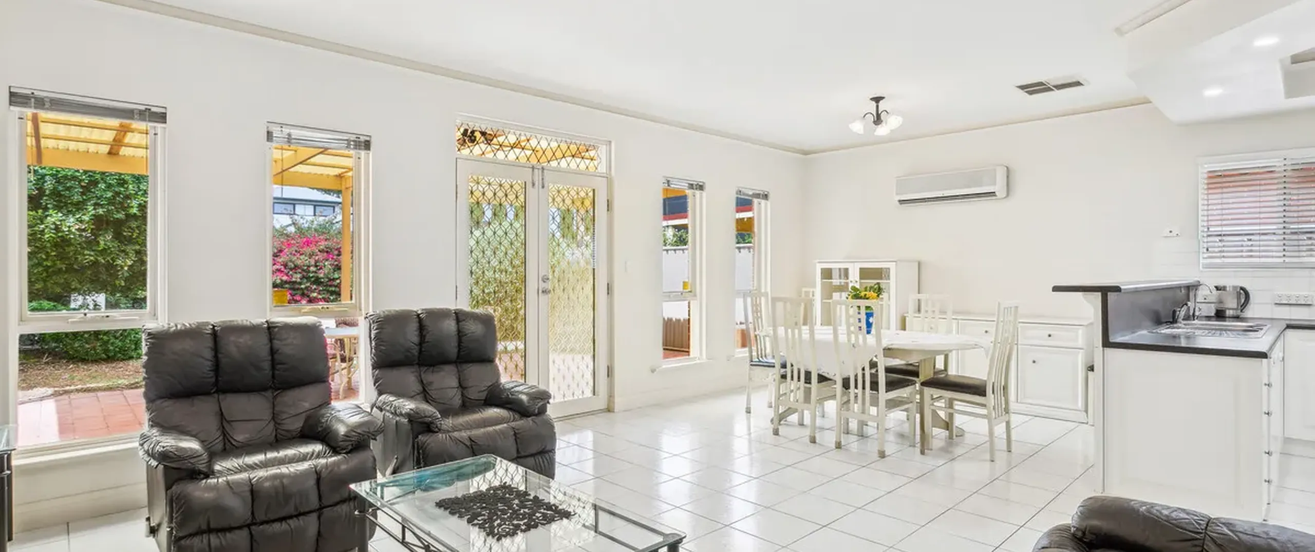 - Open plan kitchen, family and meals area with split-system air-conditioning