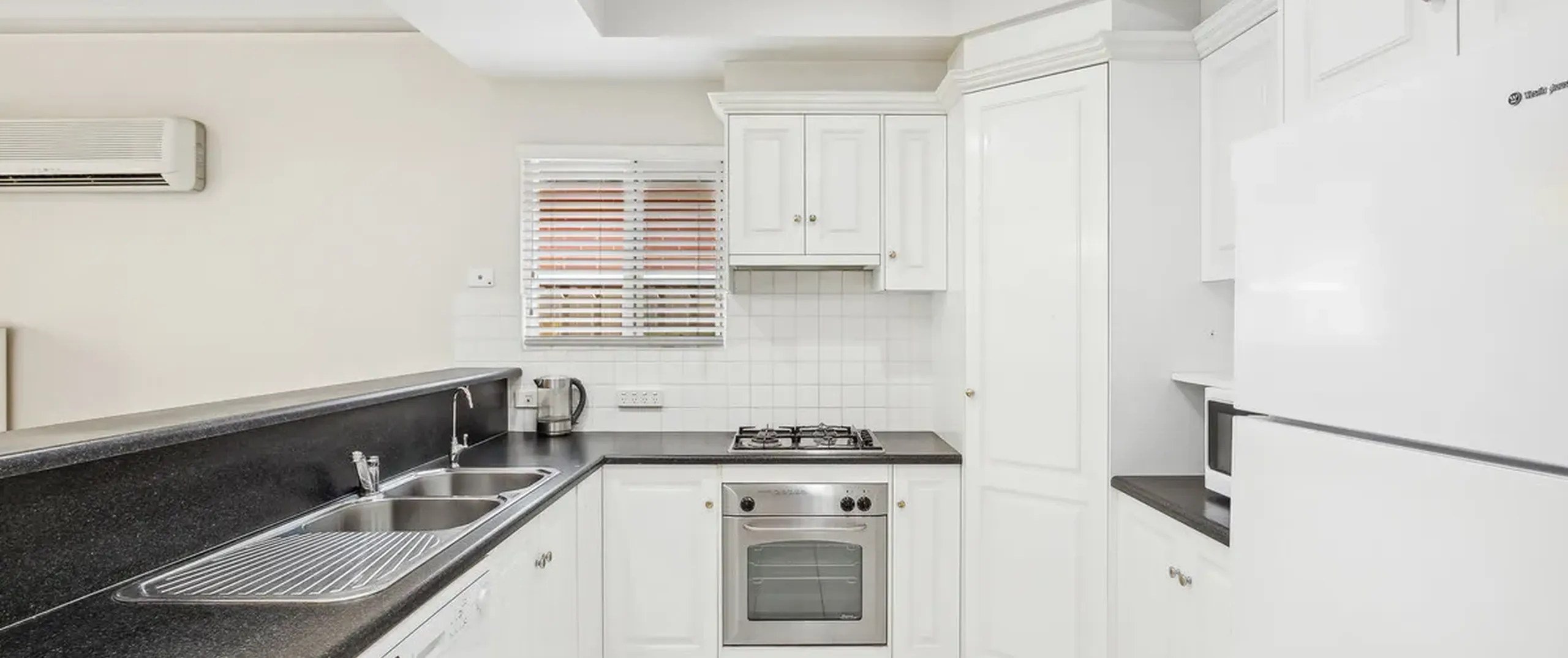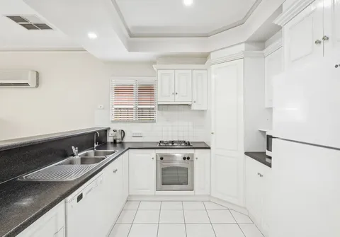 - Sleek white kitchen with gas cook top, dishwasher and ample storage space