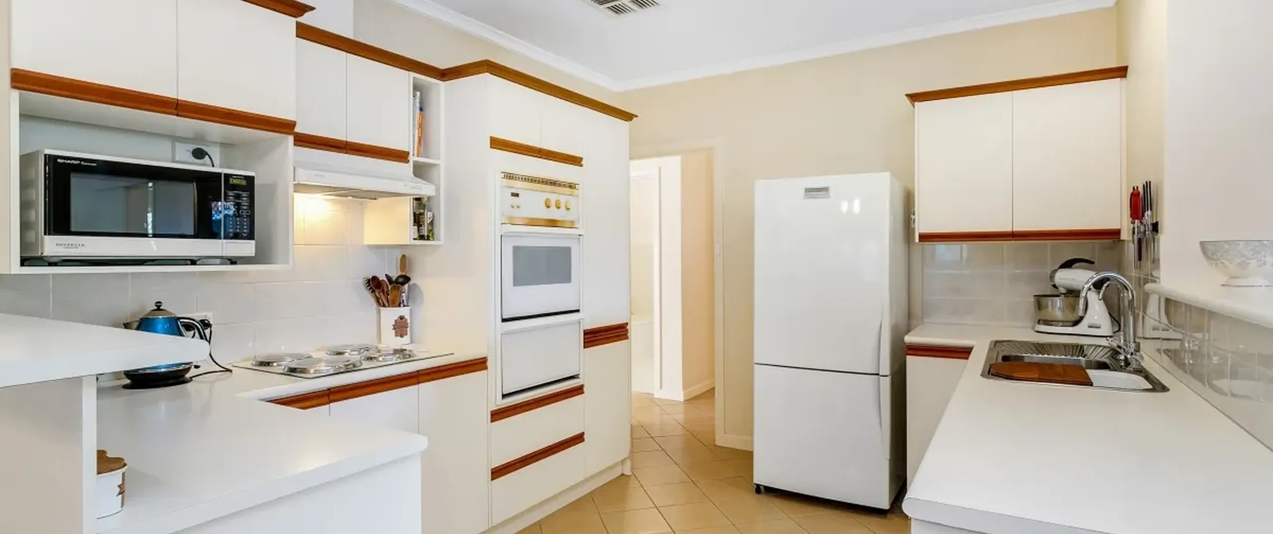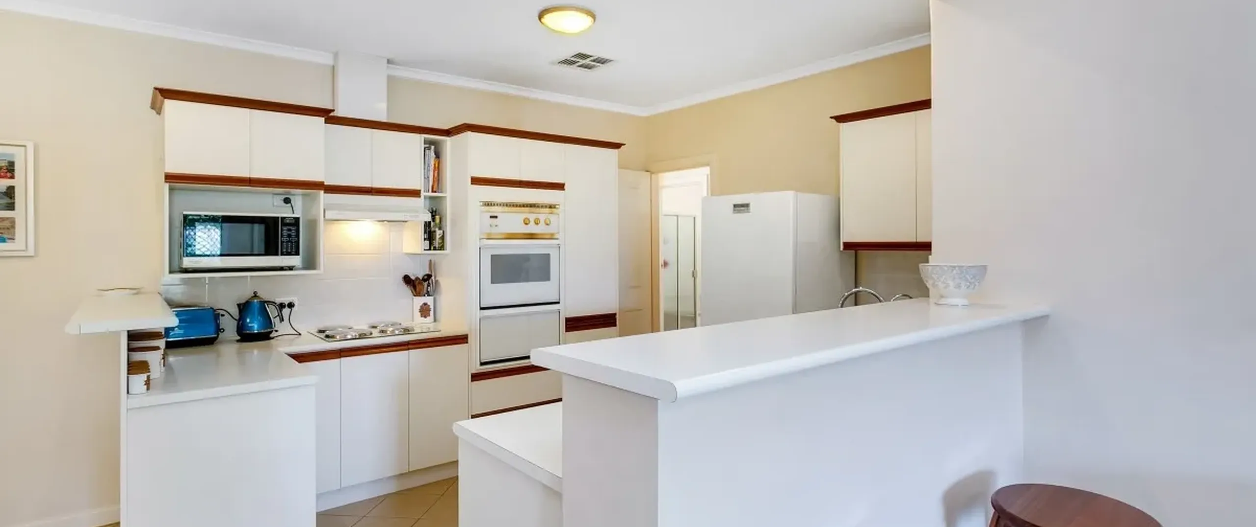 - Functional kitchen with ample bench and cupboard space, skylight and breakfast bar