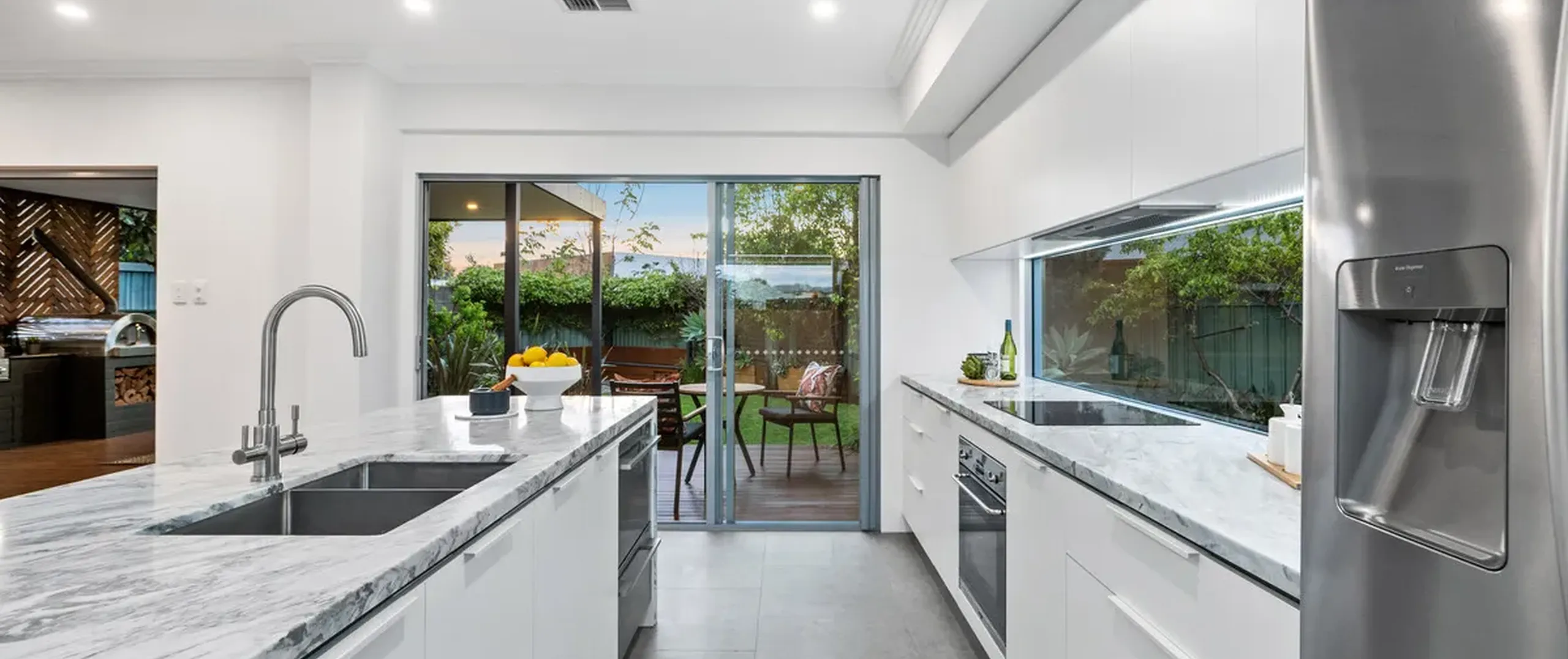 - High quality Carrera Marble waterfall benchtops in the kitchen, which continue throughout the home, including the bathroom and laundry benchtops