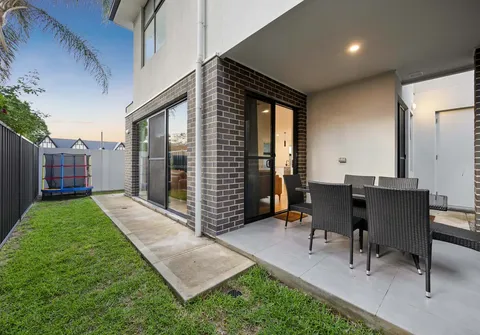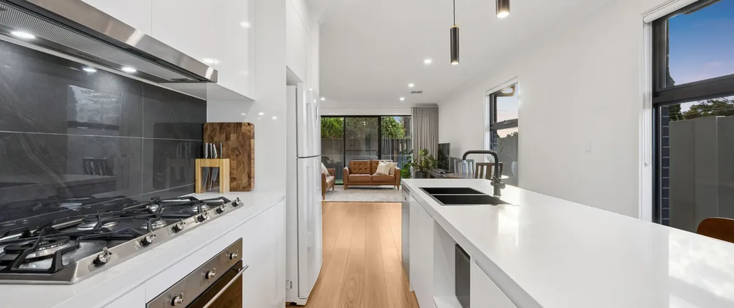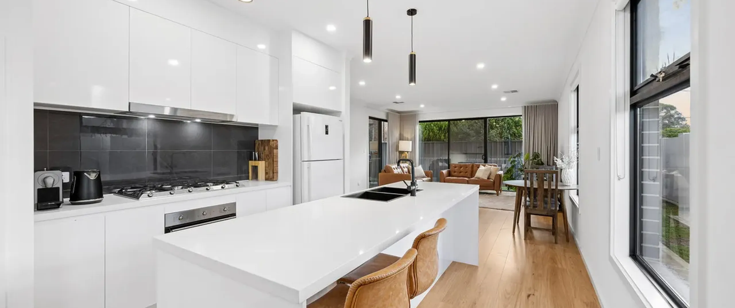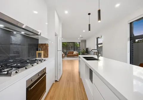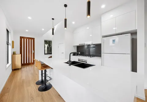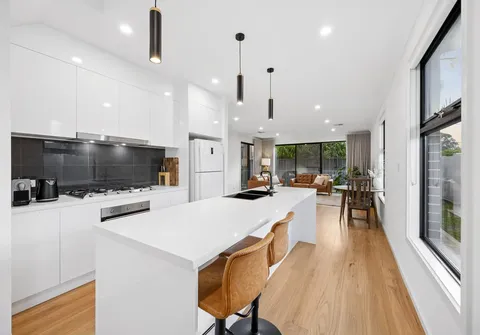 The ground floor is designed for effortless entertaining, with a sleek kitchen featuring luxury bench tops, pendant lighting and quality stainless steel appliances. The open plan dining and living area flows through sliding doors to an inviting alfresco space and a low maintenance yard.