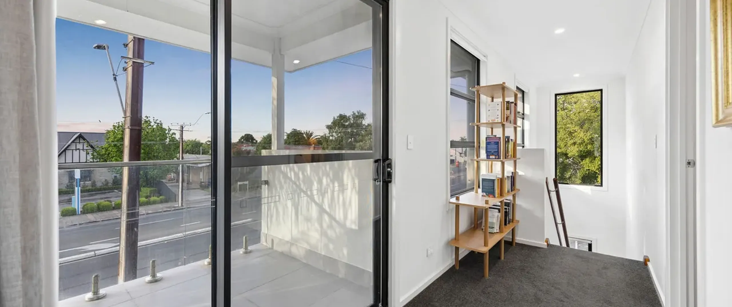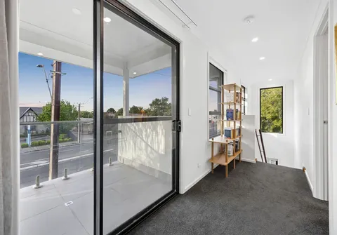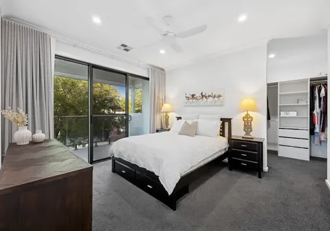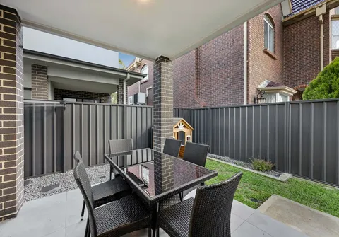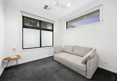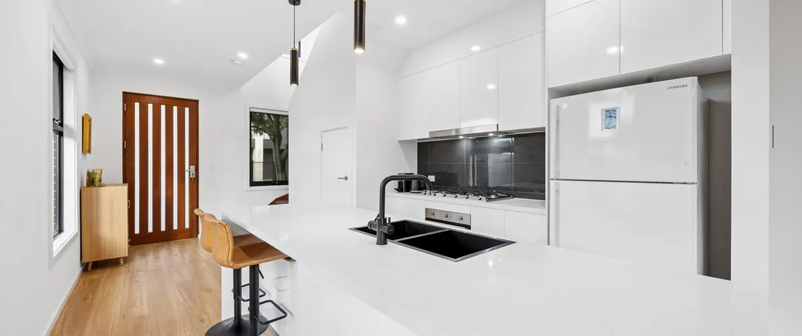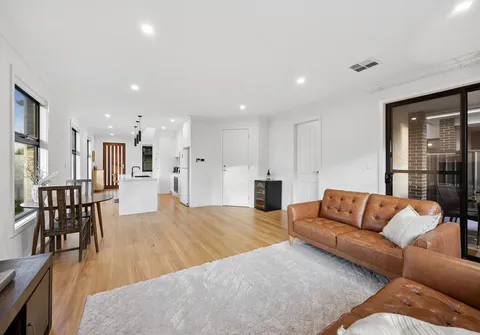 The ground floor is designed for effortless entertaining, with a sleek kitchen featuring luxury bench tops, pendant lighting and quality stainless steel appliances. The open plan dining and living area flows through sliding doors to an inviting alfresco space and a low maintenance yard.