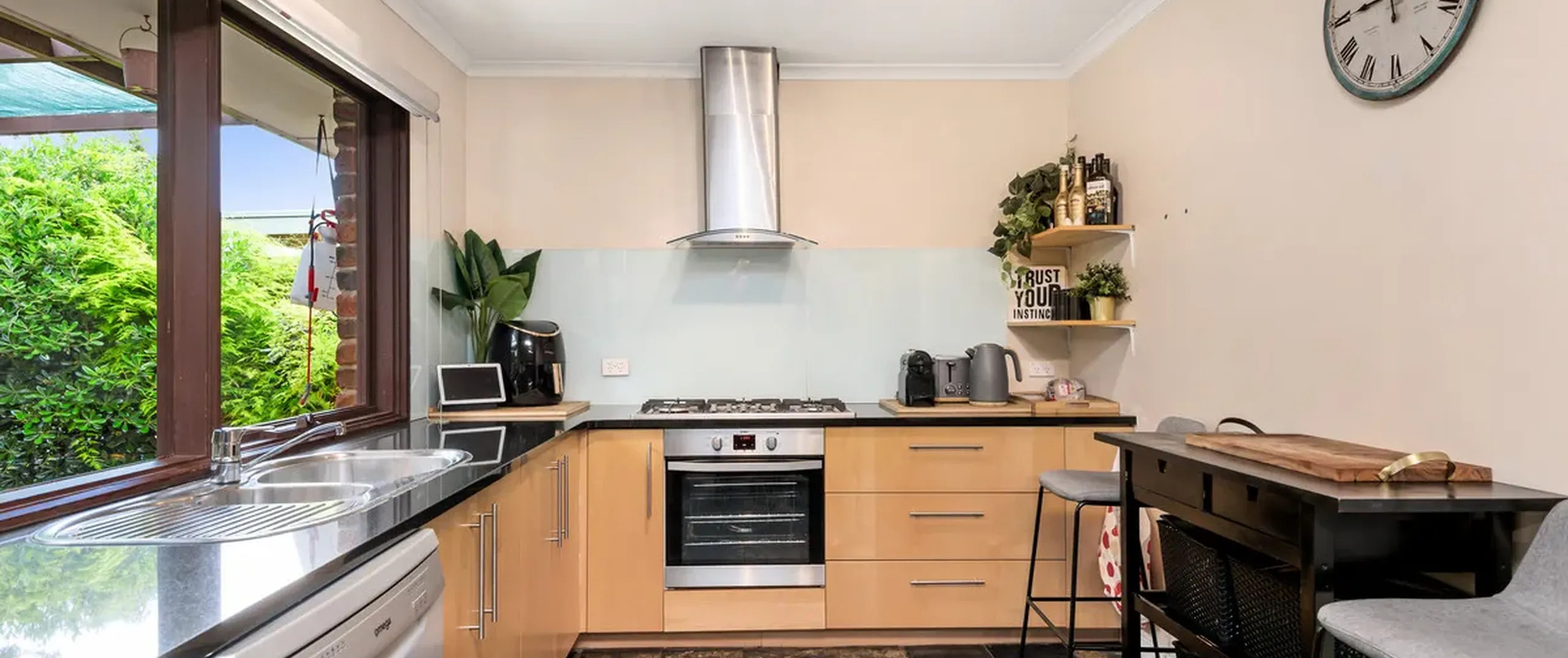 - Renovated kitchen with stone benchtops, stainless steel appliances and gas cooktop