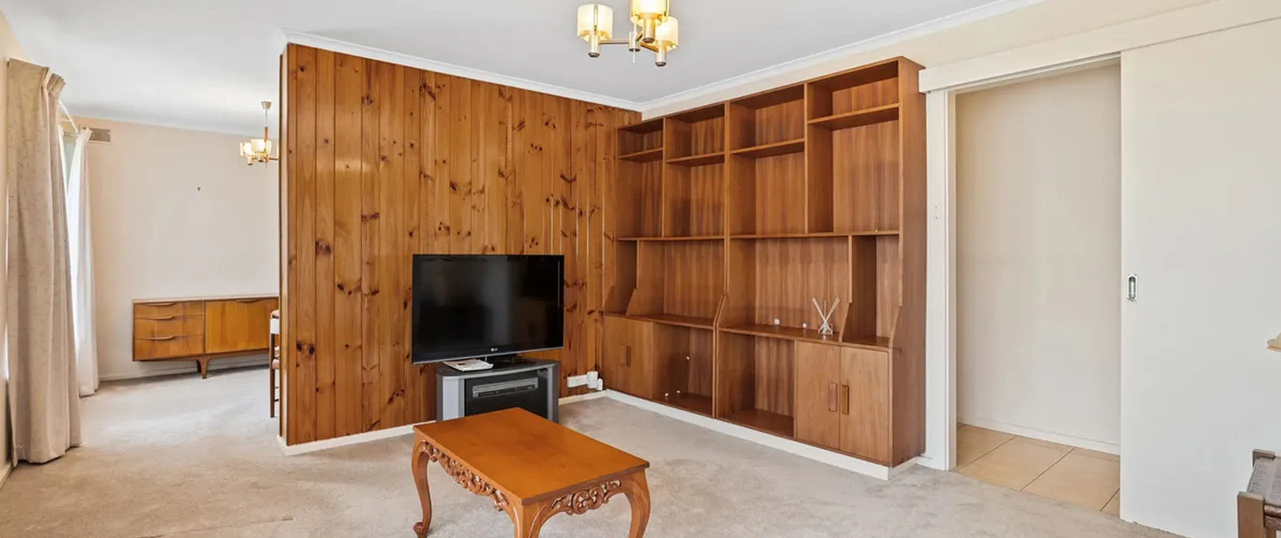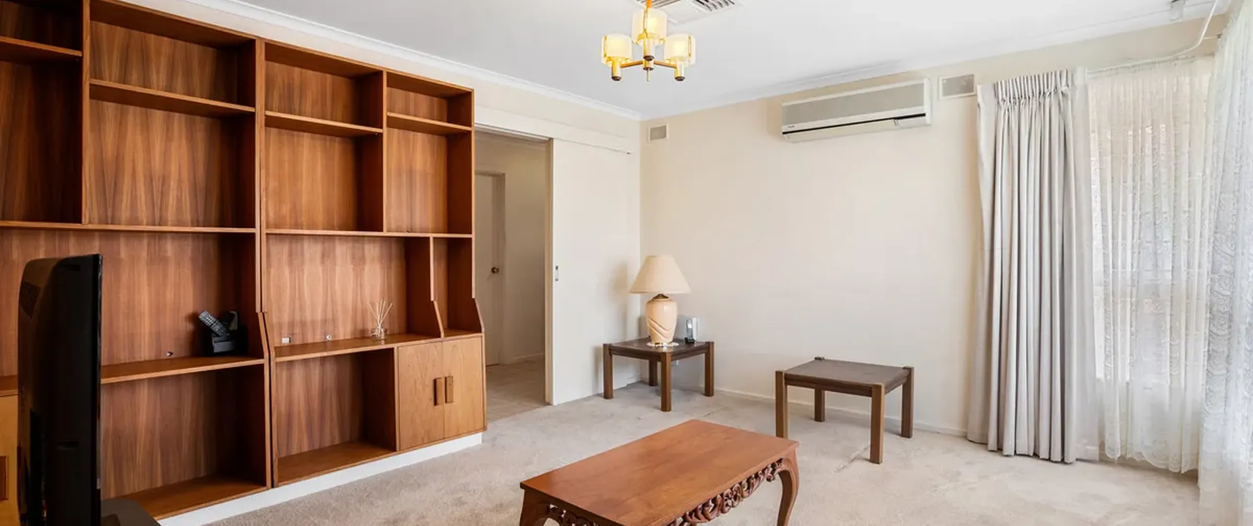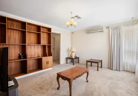 - Light filled lounge room with built-in shelving and split system air conditioner