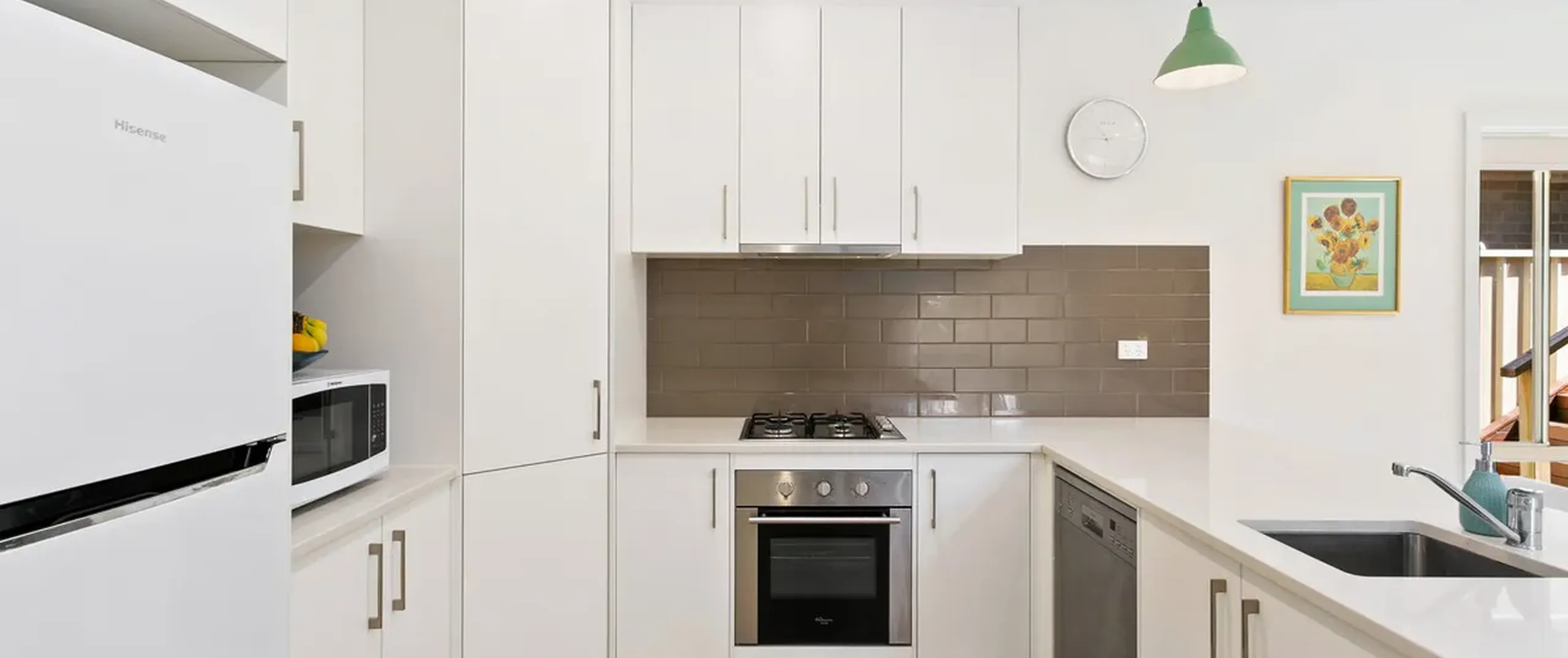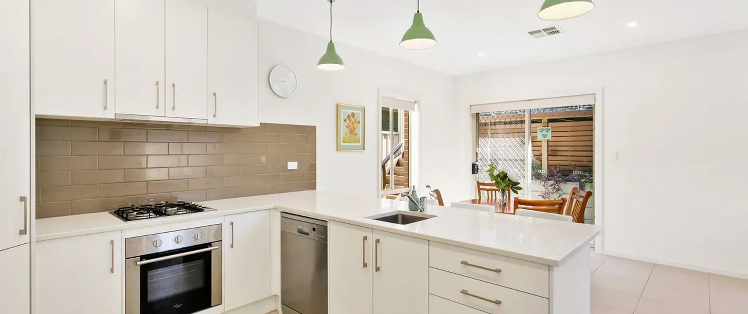 - Chic white kitchen with stainless steel gas cooktop and dishwasher, large pantry, ample cupboard space and benchtop with breakfast bar