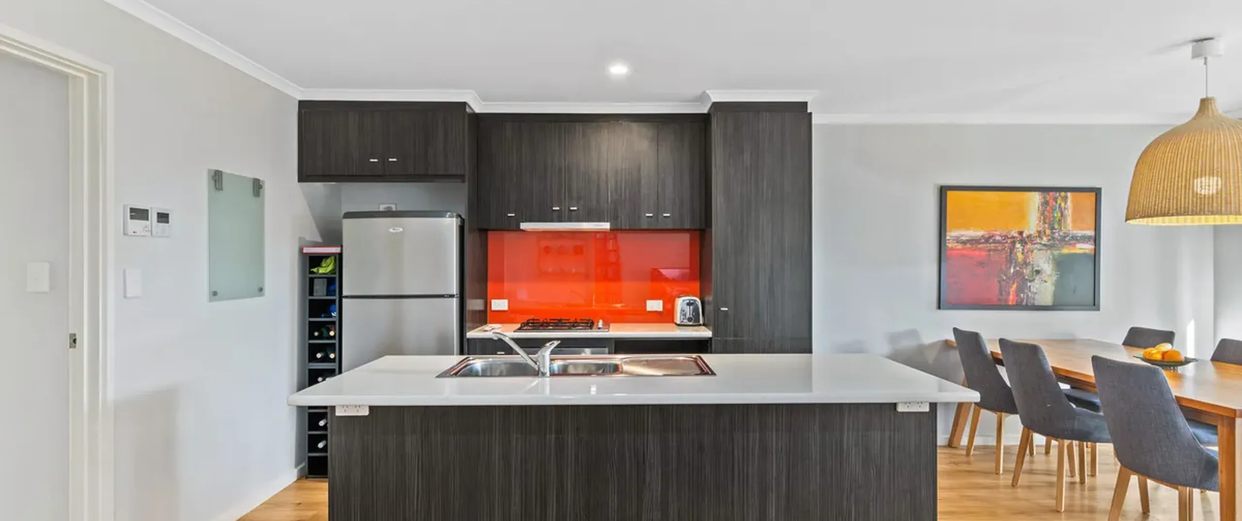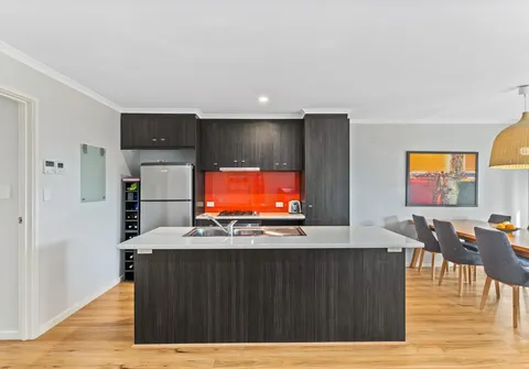 - Stylish and functional kitchen with stainless steel gas cooktop, dishwasher, ample cupboard space and benchtop with breakfast bar