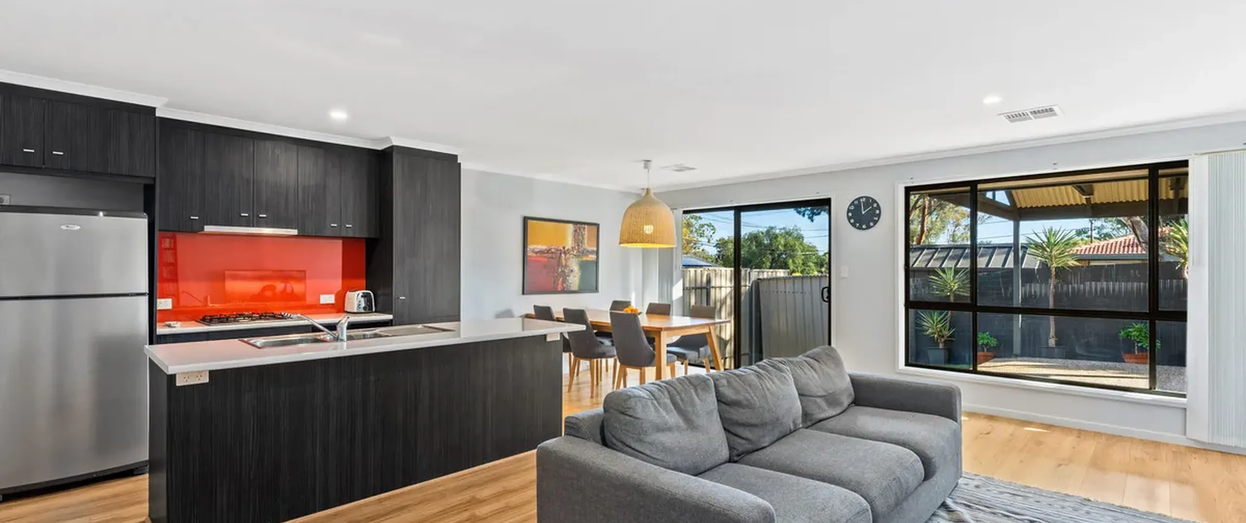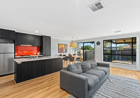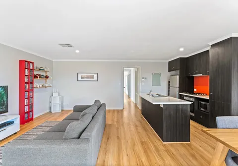 - Spacious open-plan dining, living and kitchen areas adorned with easy-care flooring