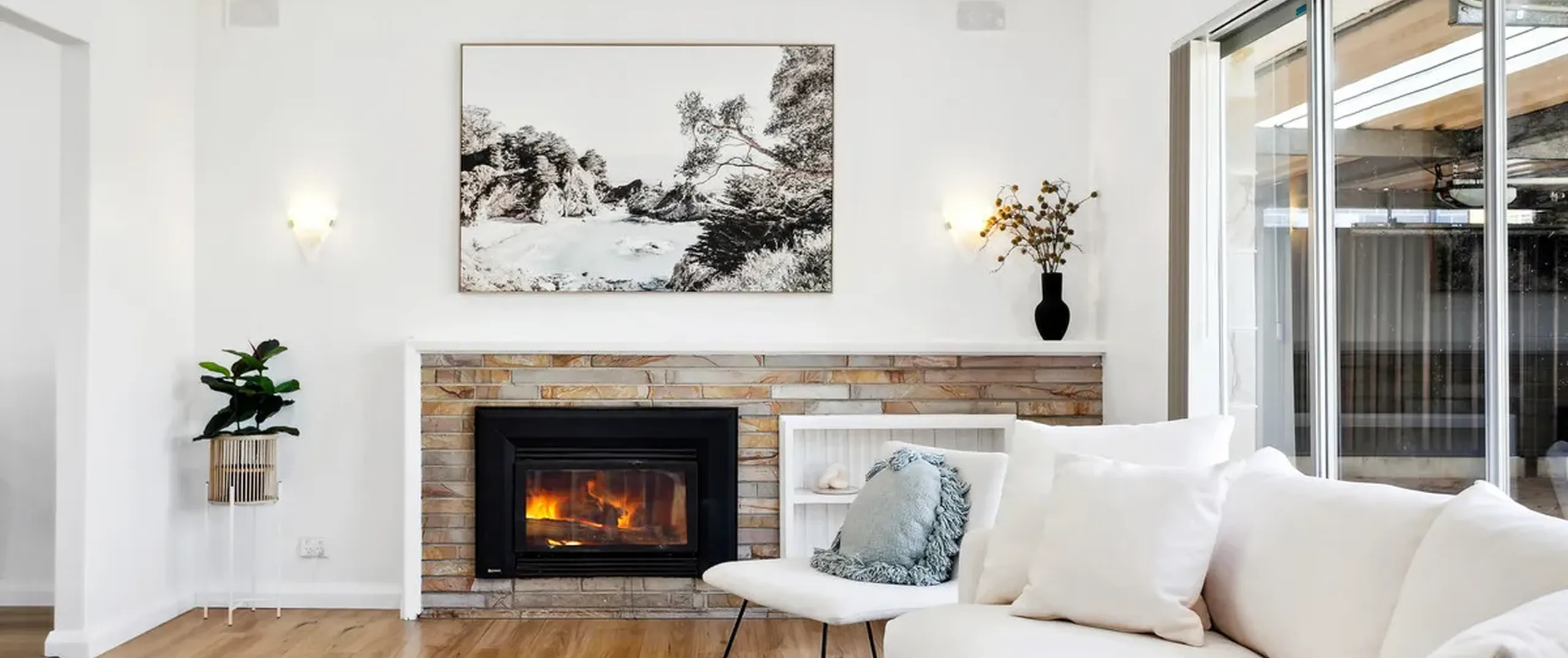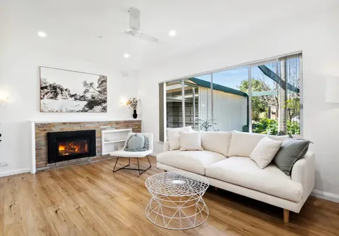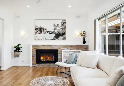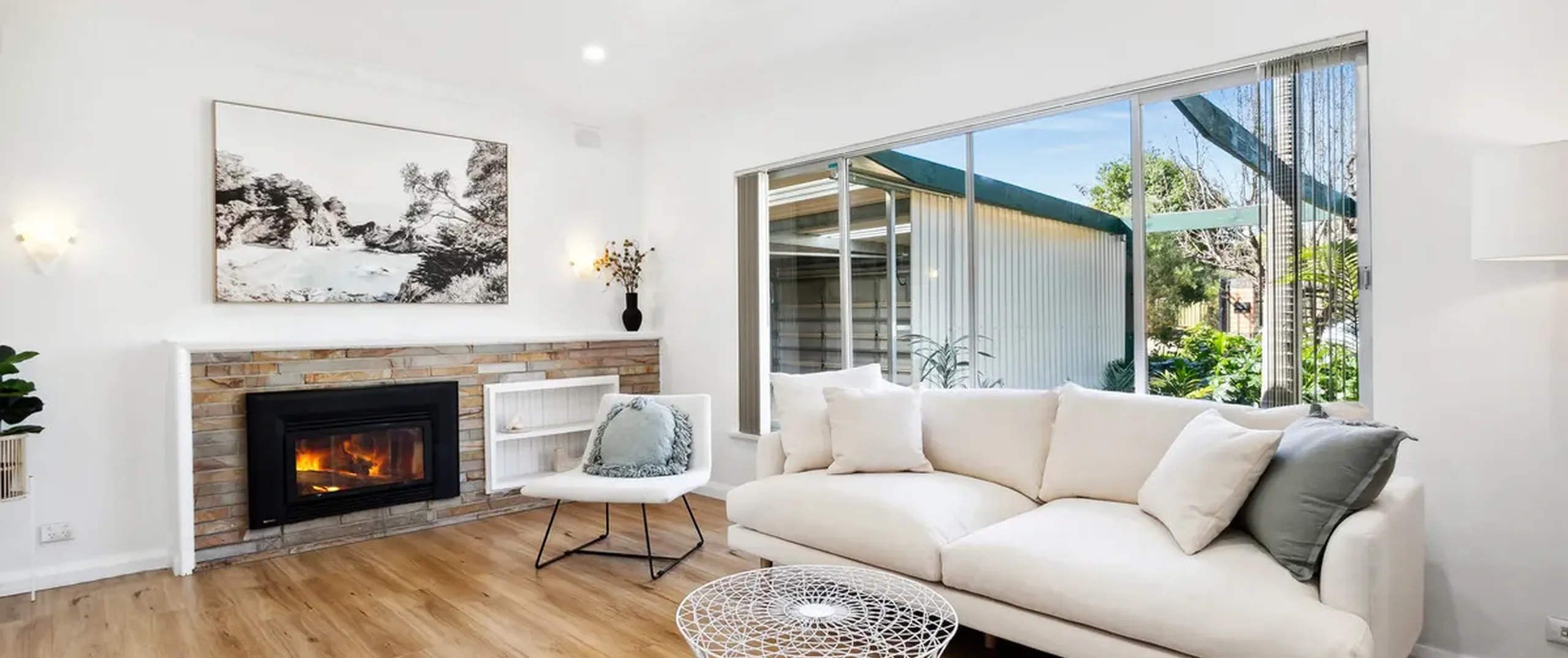 - Charming lounge room upon entry with gas heater mantel price, ceiling fan, LED downlights and sun-lit through the large window