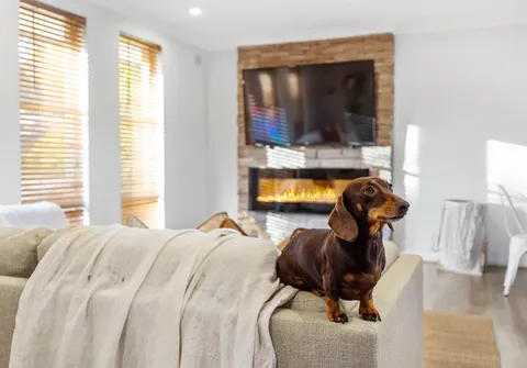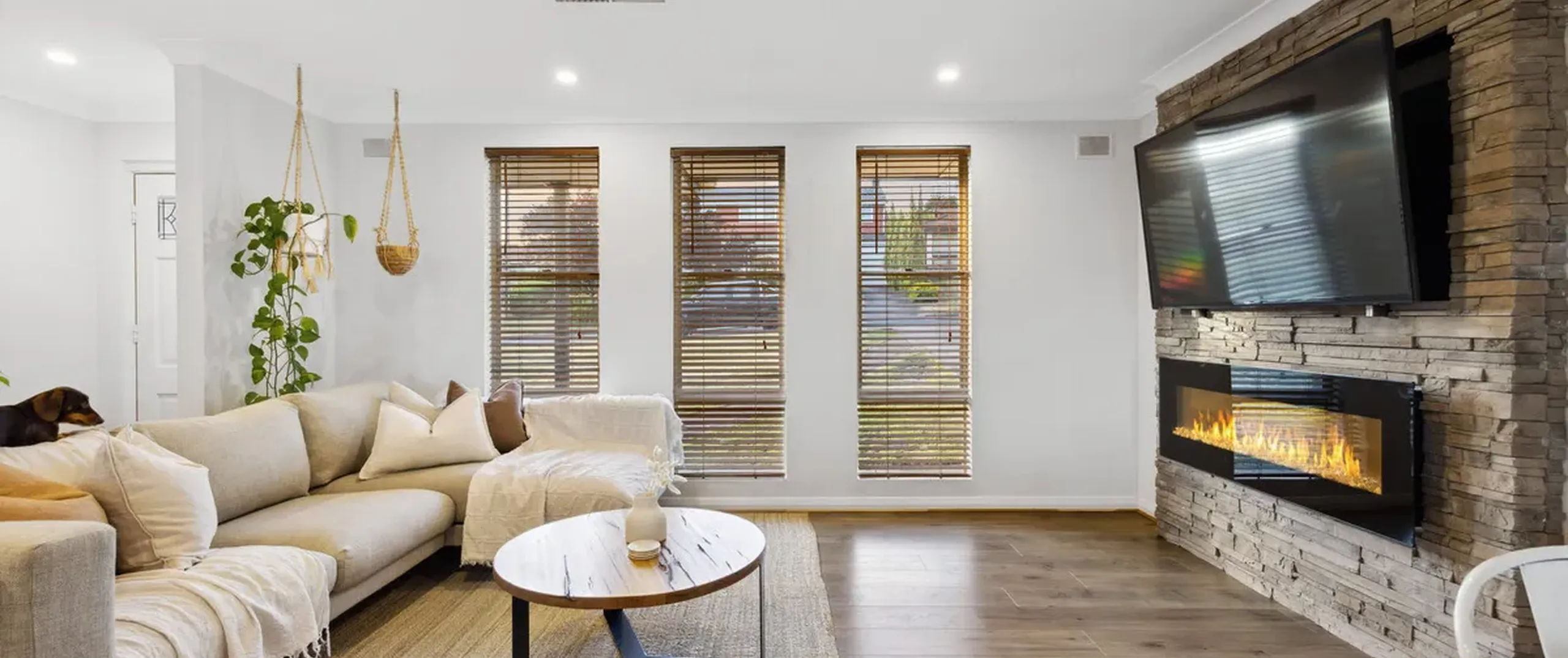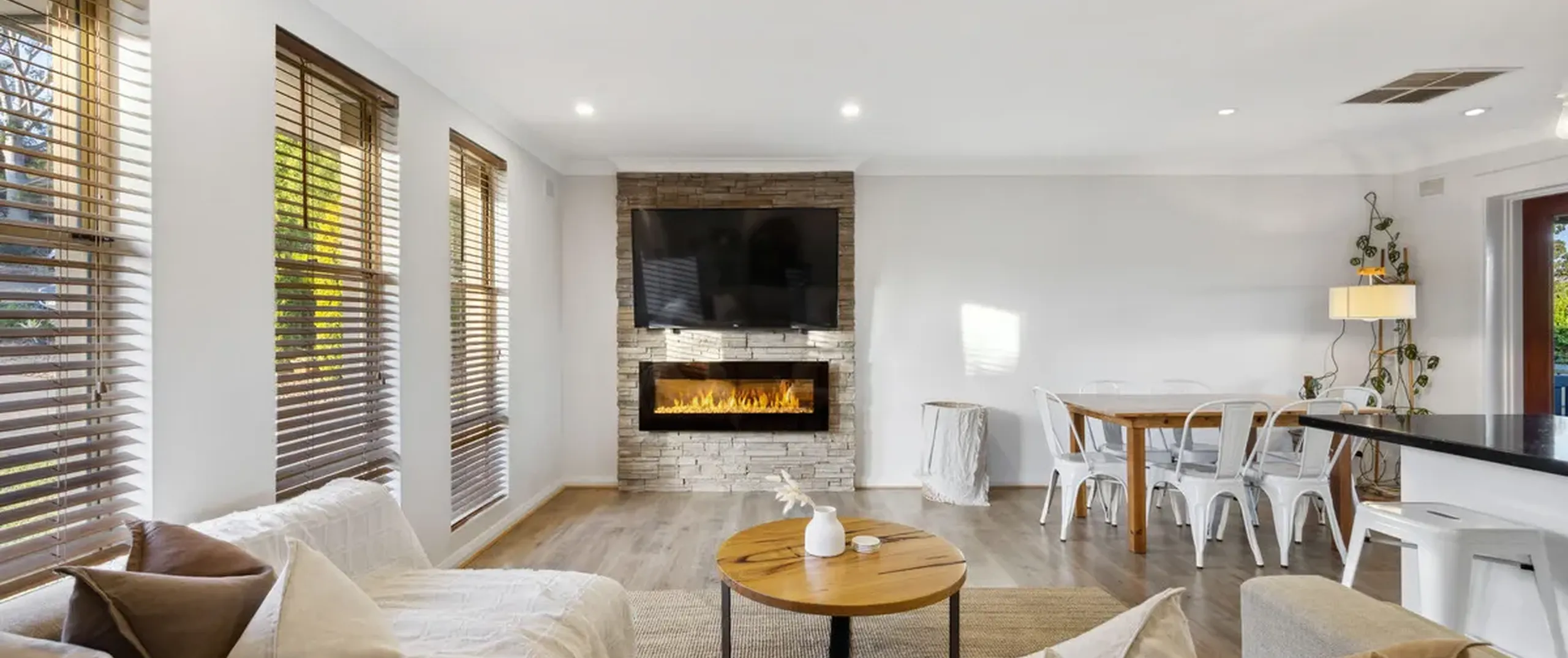 - Light-filled open-plan meals and living area with stone feature mantel with electric heater