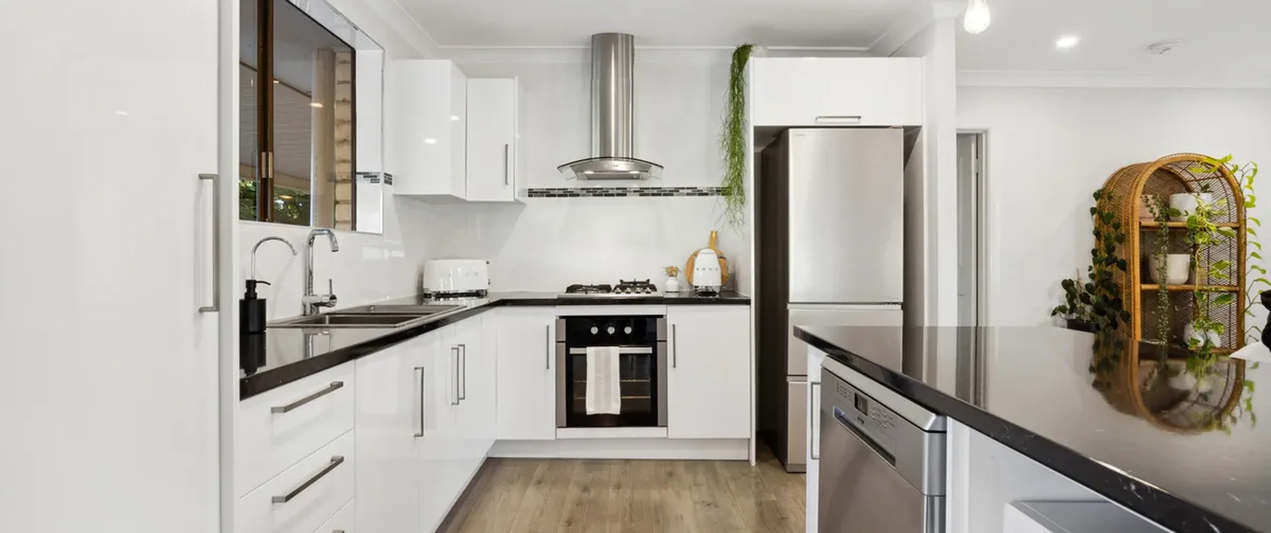 - Modern kitchen with stainless steel oven and gas cooktop, dishwasher, complete with ample cupboard and bench space